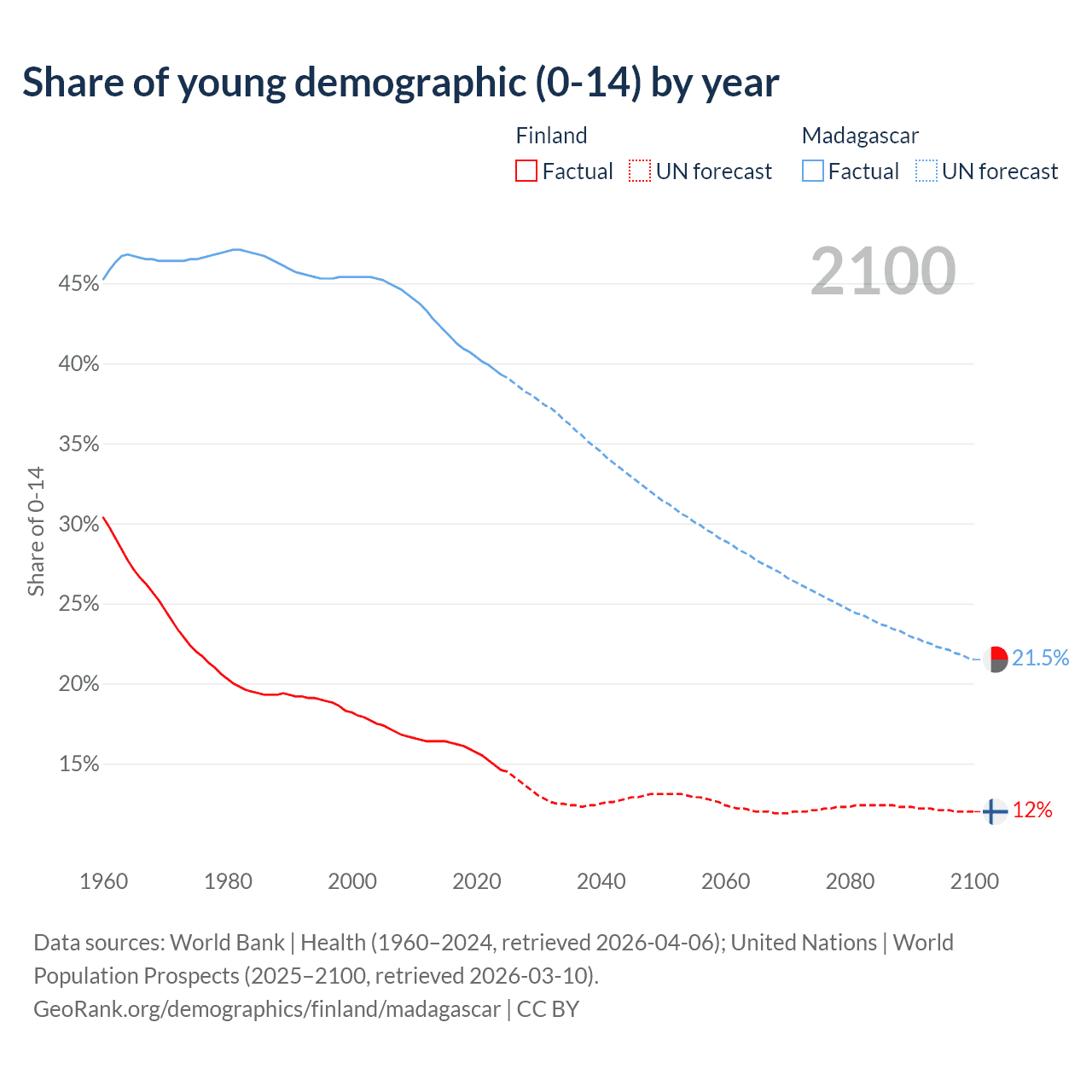 - The share of young demographic (0-15 years old) in Finland is 14.6% vs 39.3% in Madagascar.
