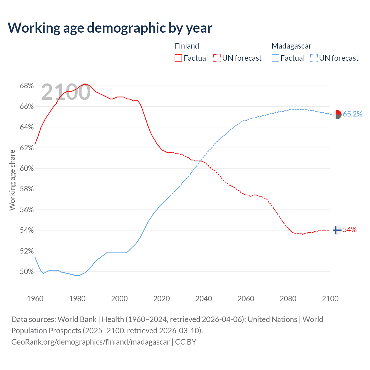 - Finland has 3.46M working age adults (aged 15-64) vs 19.4M in Madagascar.