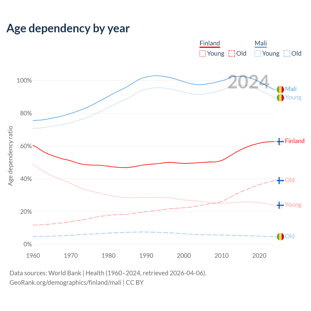 - The share of old-age demographic (65+) in Finland is 23.9% vs 2.38% in Mali.