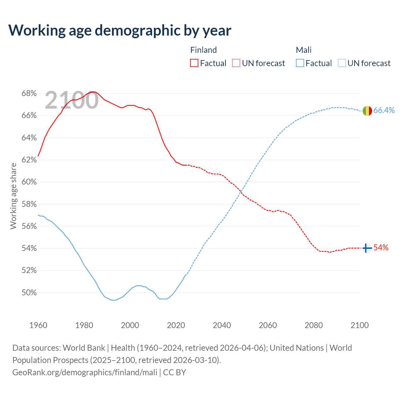 - Finland has 3.46M working age adults (aged 15-64) vs 13.5M in Mali.