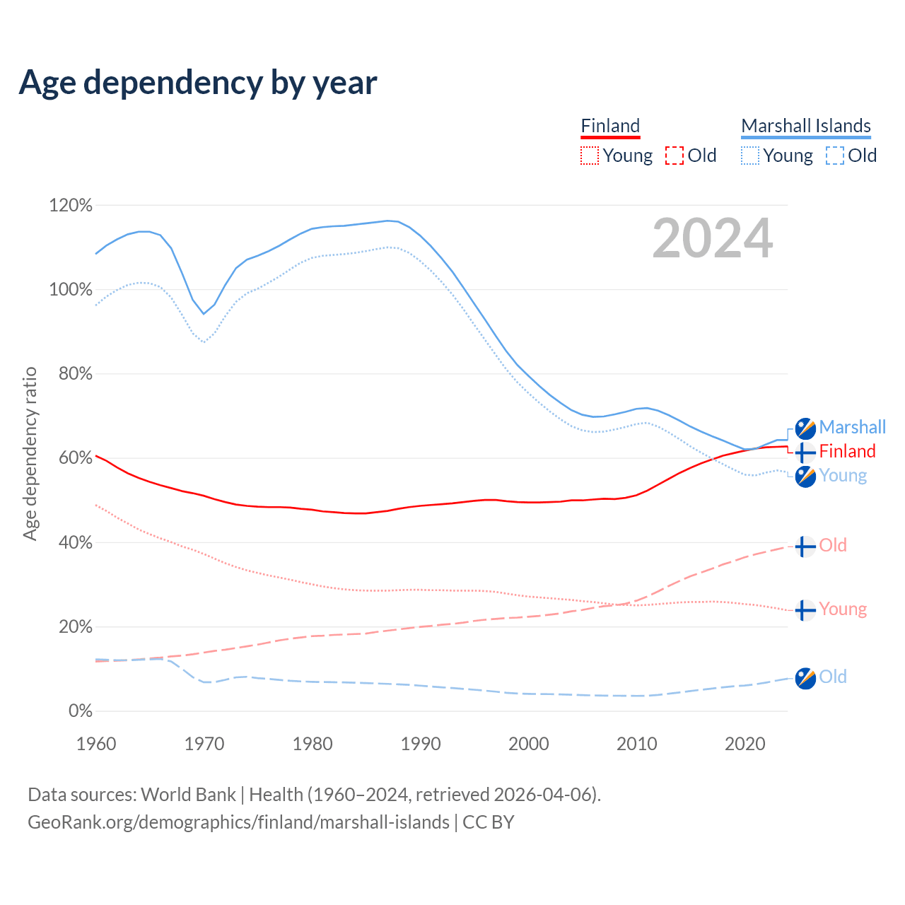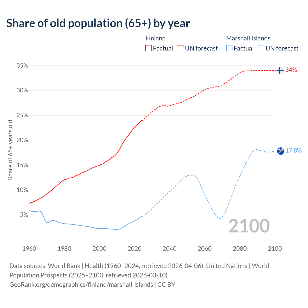- The share of old-age demographic (65+) in Finland is 23.9% vs 4.64% in the Marshall Islands.