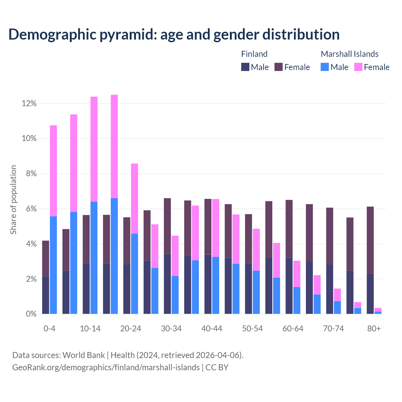 - As of 2026, the population of Finland is 5.63M vs 35.1K in the Marshall Islands - 160.6 times difference.