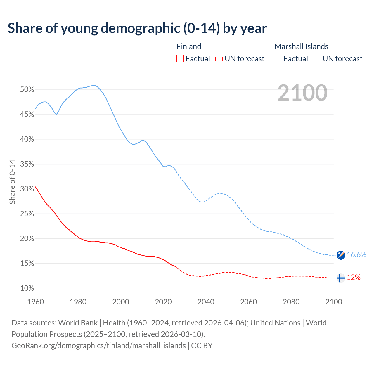 - The share of young demographic (0-15 years old) in Finland is 14.6% vs 34.5% in the Marshall Islands.