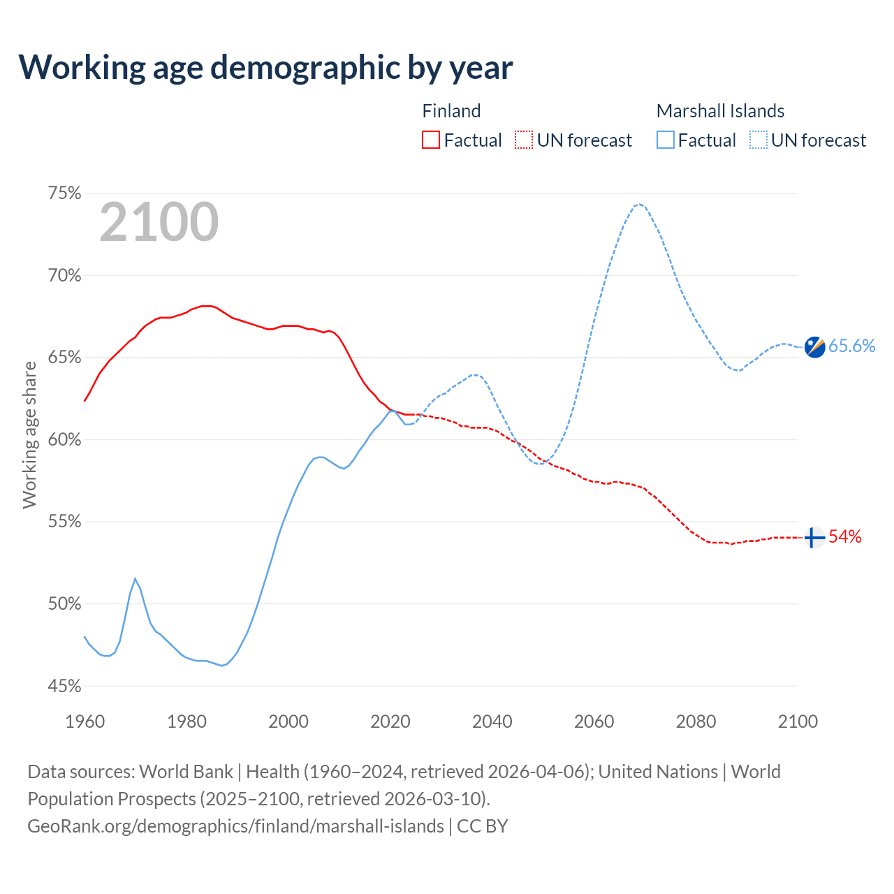 - Finland has 3.46M working age adults (aged 15-64) vs 21.3K in the Marshall Islands.