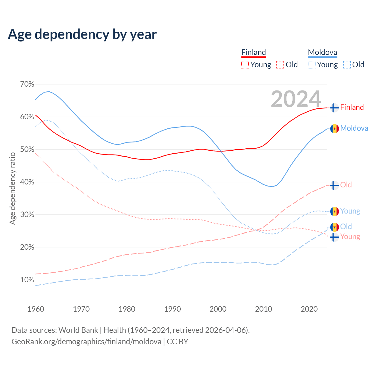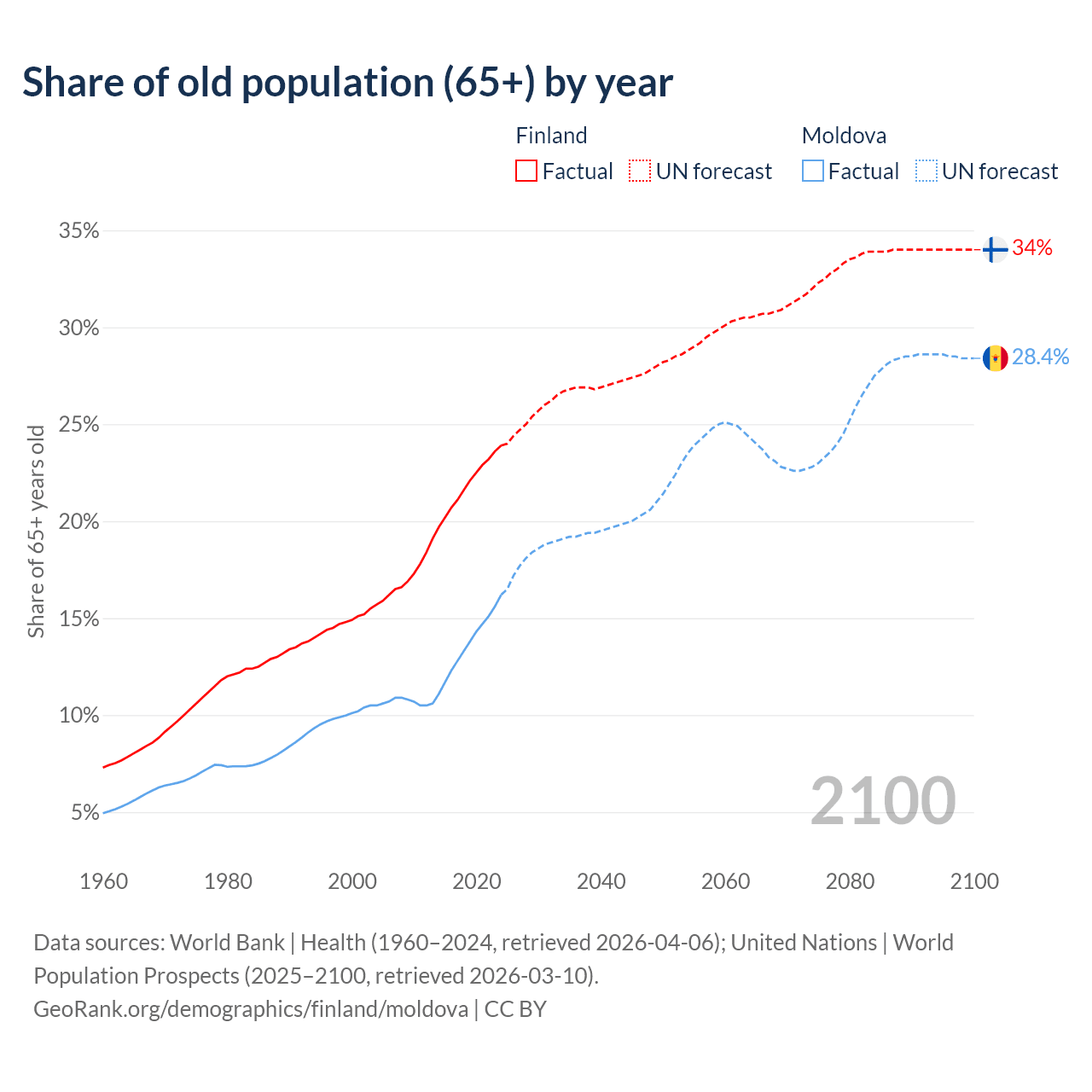 - The share of old-age demographic (65+) in Finland is 23.9% vs 16.2% in Moldova.