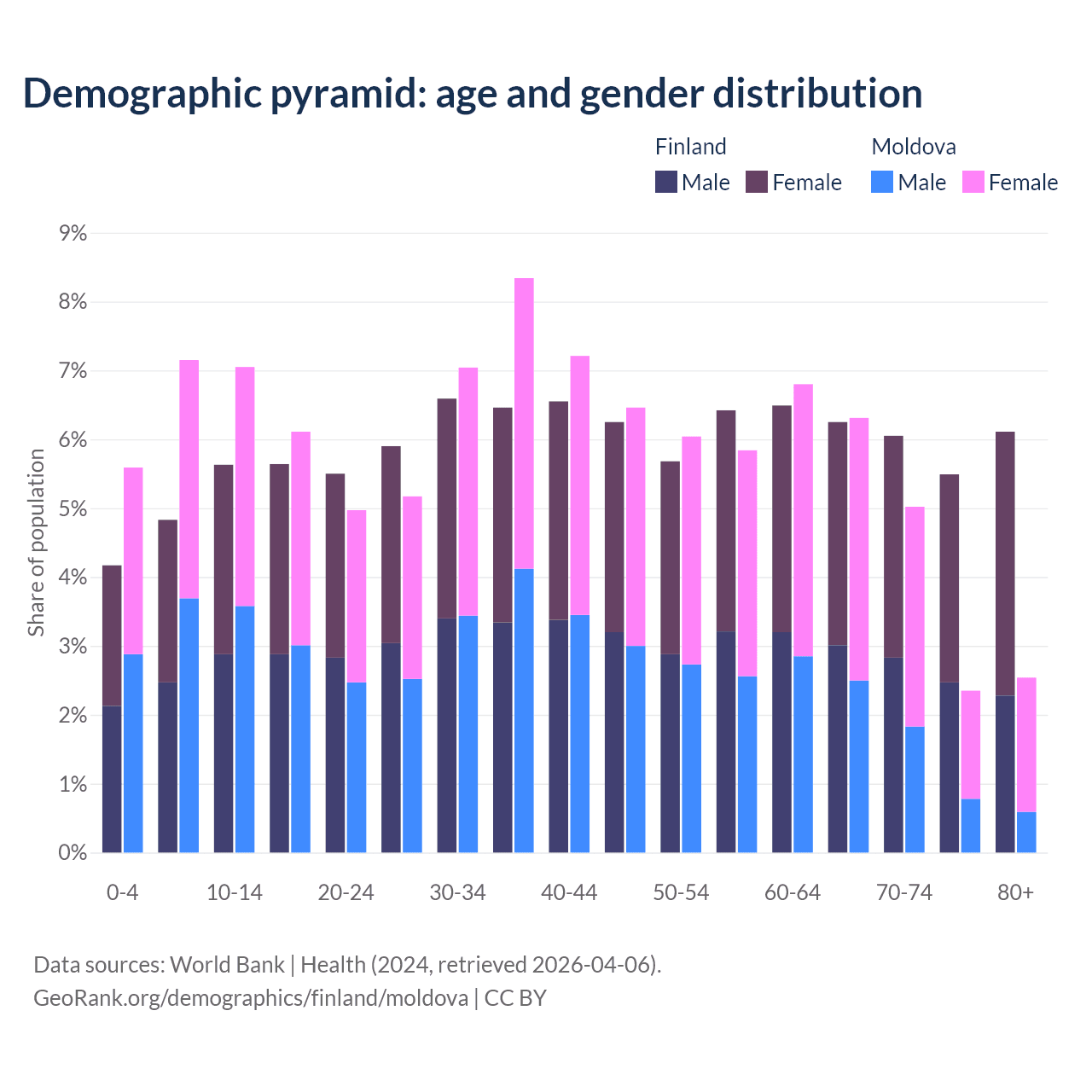 - Finland is ranked 22/196 by median age (oldest to youngest) vs 54/196 for Moldova.