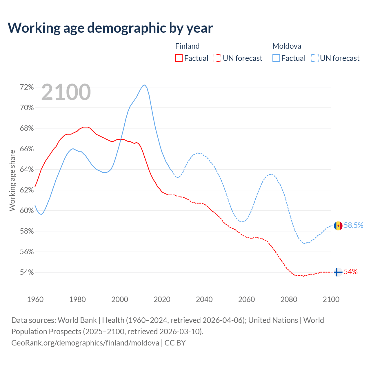 - Finland has 3.46M working age adults (aged 15-64) vs 1.5M in Moldova.
