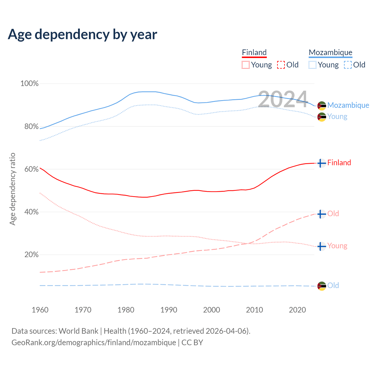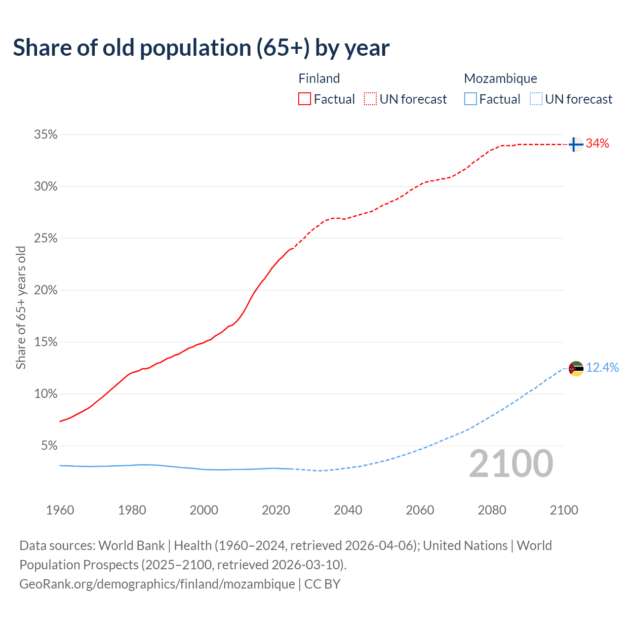 - The share of old-age demographic (65+) in Finland is 23.9% vs 2.75% in Mozambique.