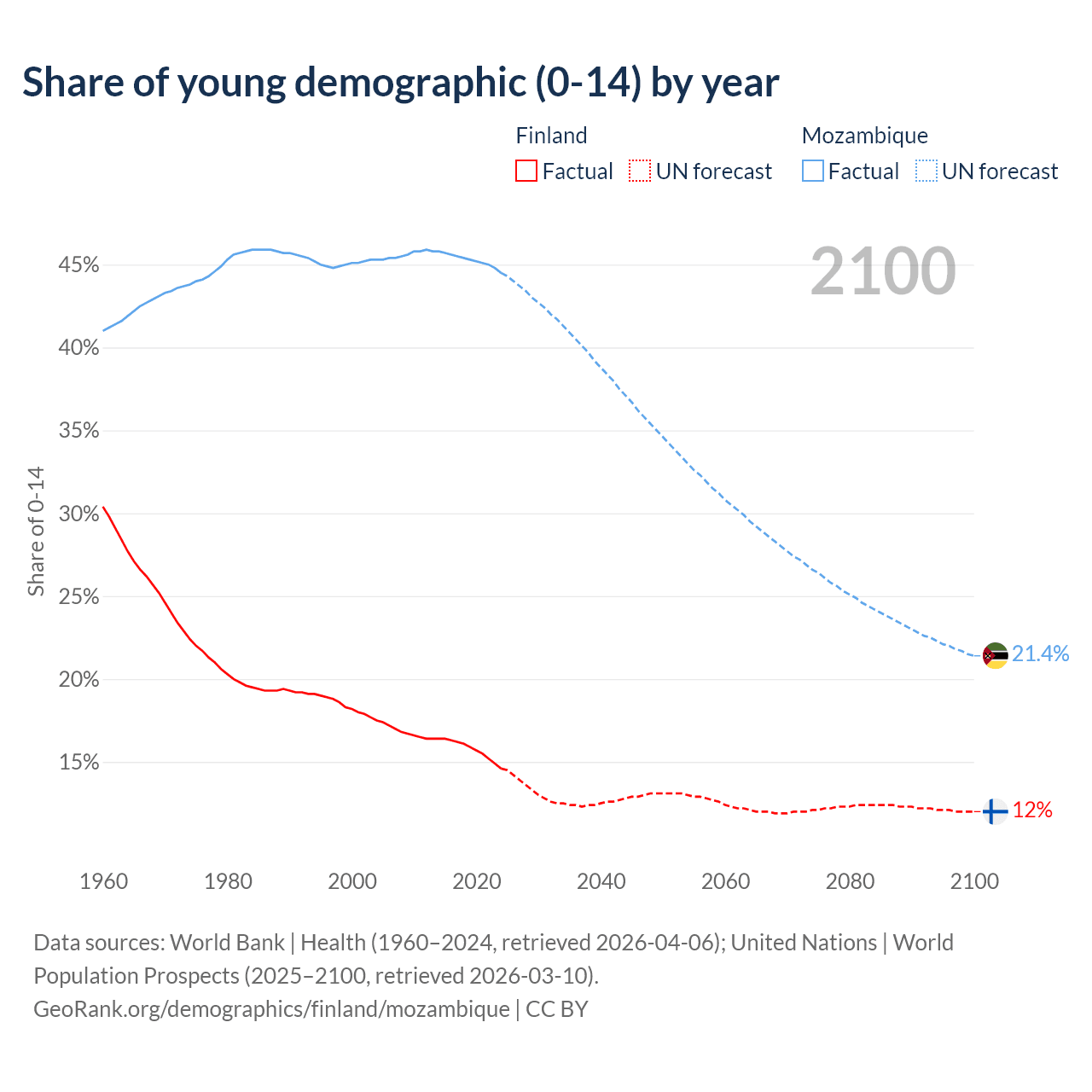 - The share of young demographic (0-15 years old) in Finland is 14.6% vs 44.5% in Mozambique.
