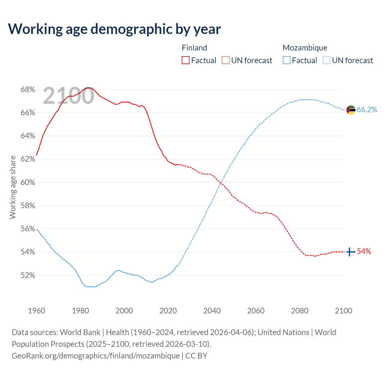 - Finland has 3.46M working age adults (aged 15-64) vs 19.5M in Mozambique.