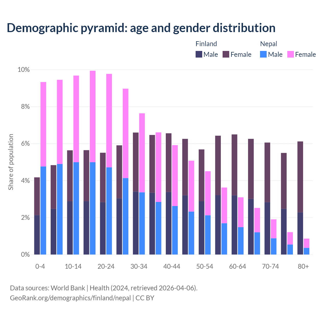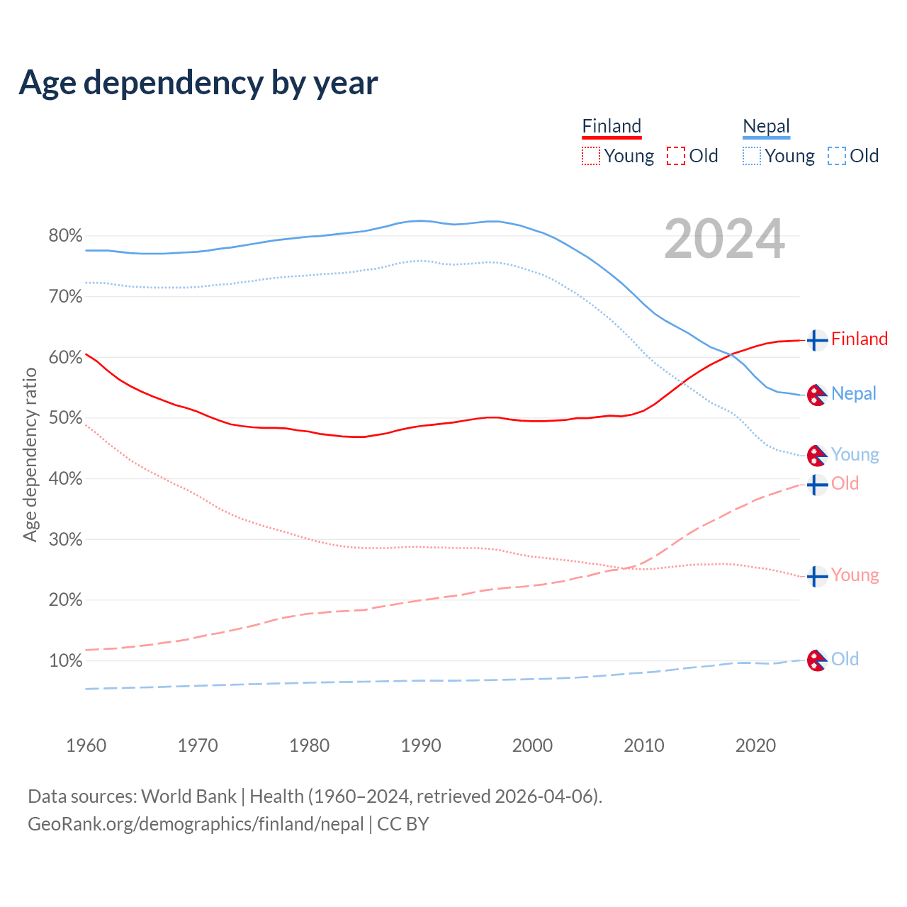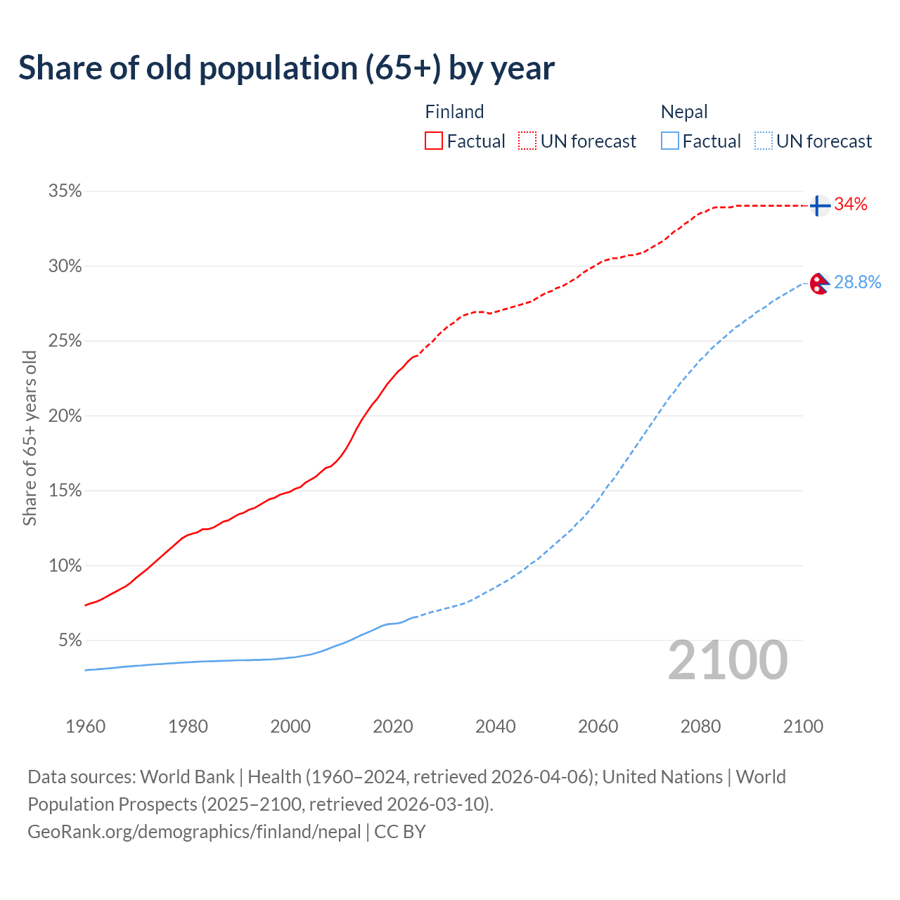 - The share of old-age demographic (65+) in Finland is 23.9% vs 6.5% in Nepal.