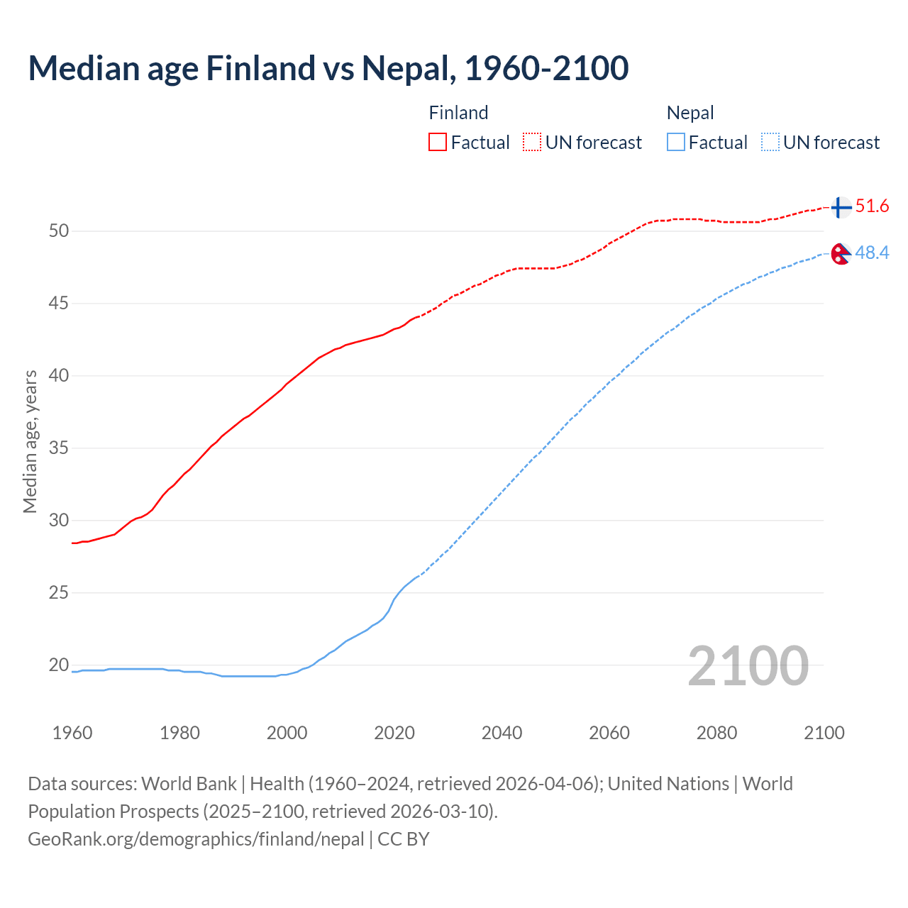 - The median age in Finland is 44 years compared to 26 years in Nepal.