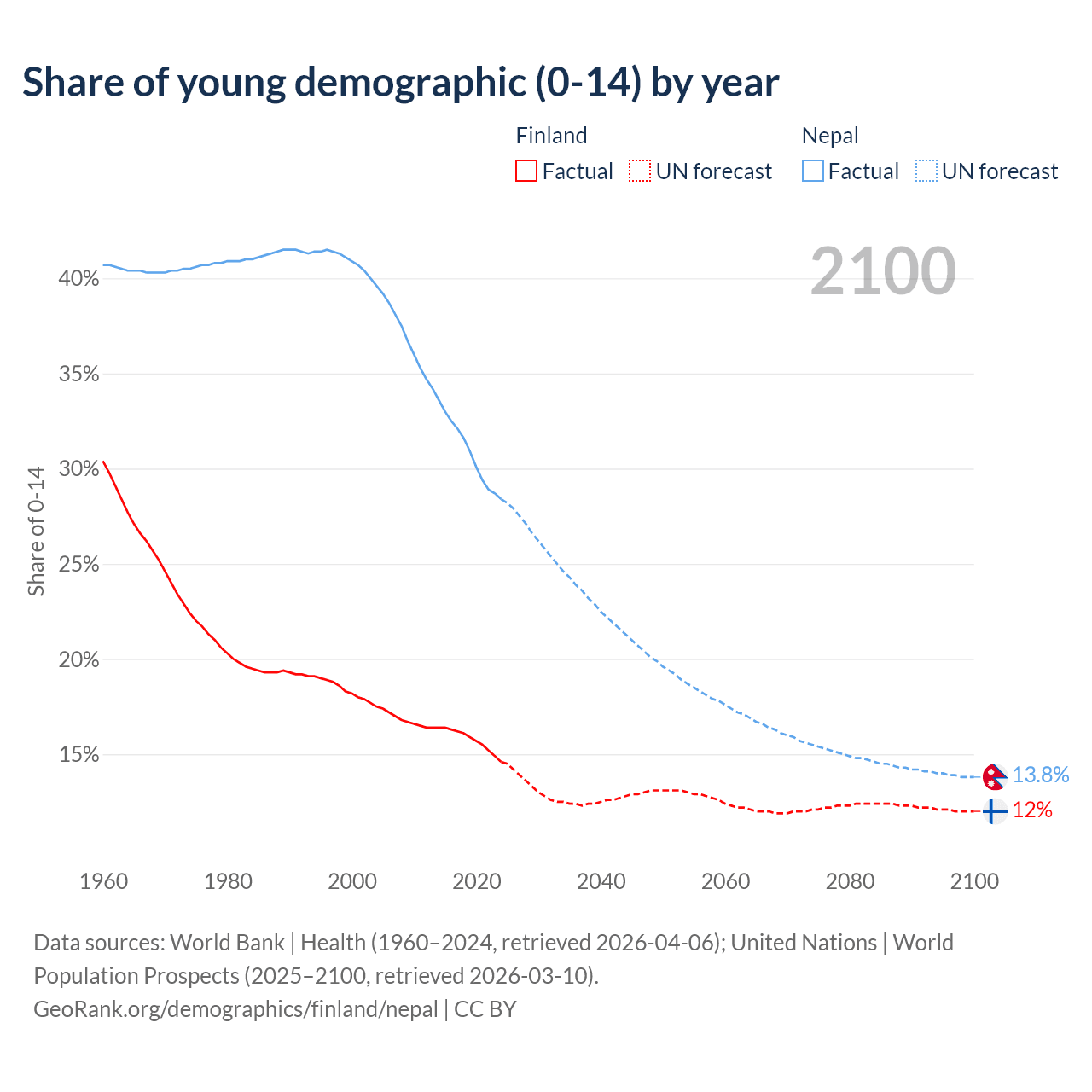 - The share of young demographic (0-15 years old) in Finland is 14.6% vs 28.4% in Nepal.
