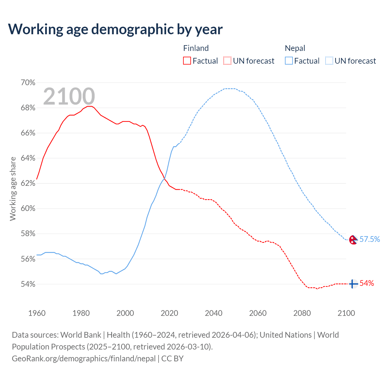 - Finland has 3.46M working age adults (aged 15-64) vs 19.3M in Nepal.