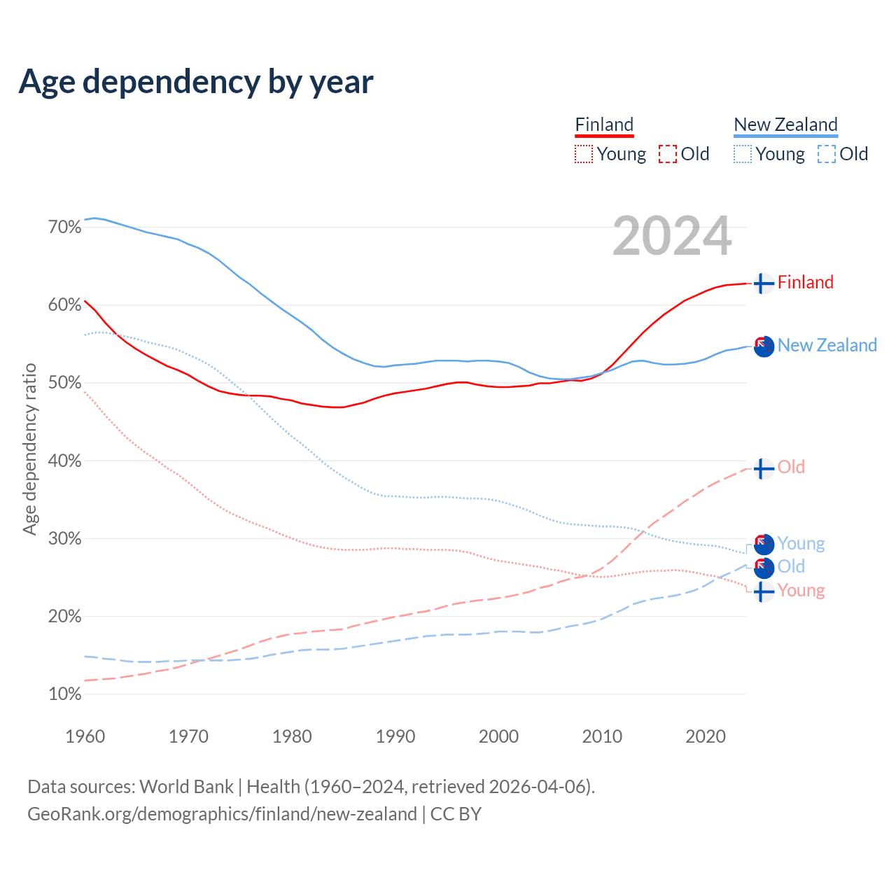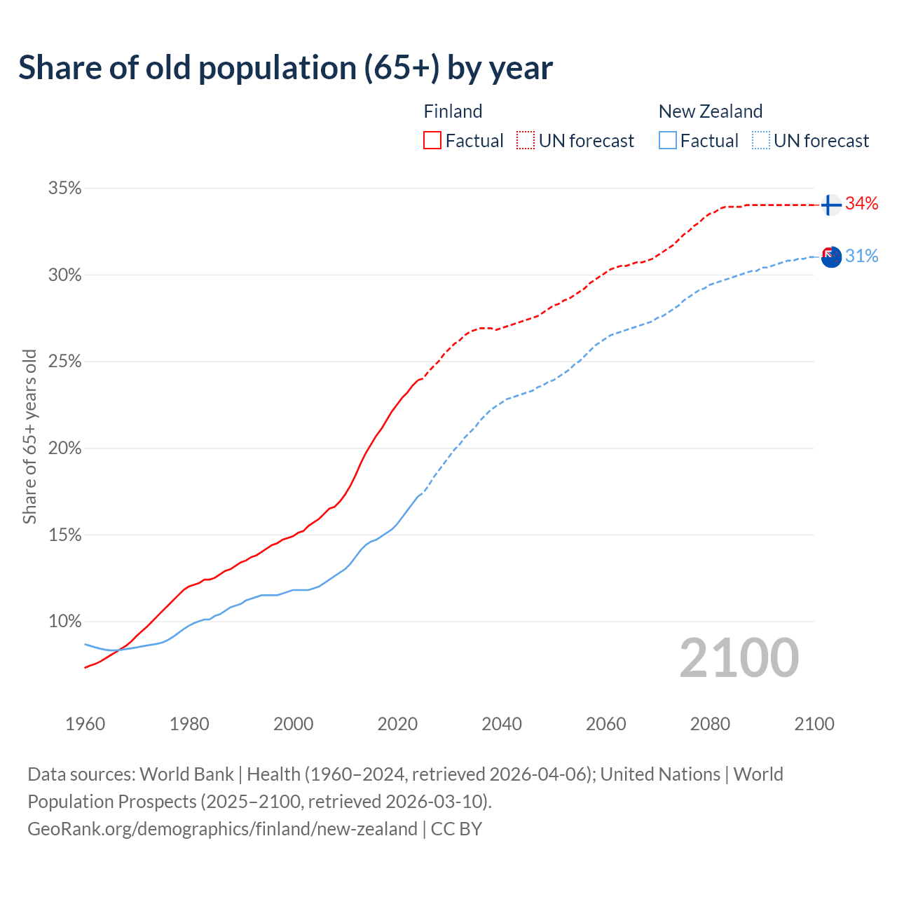 - The share of old-age demographic (65+) in Finland is 23.9% vs 17.2% in New Zealand.