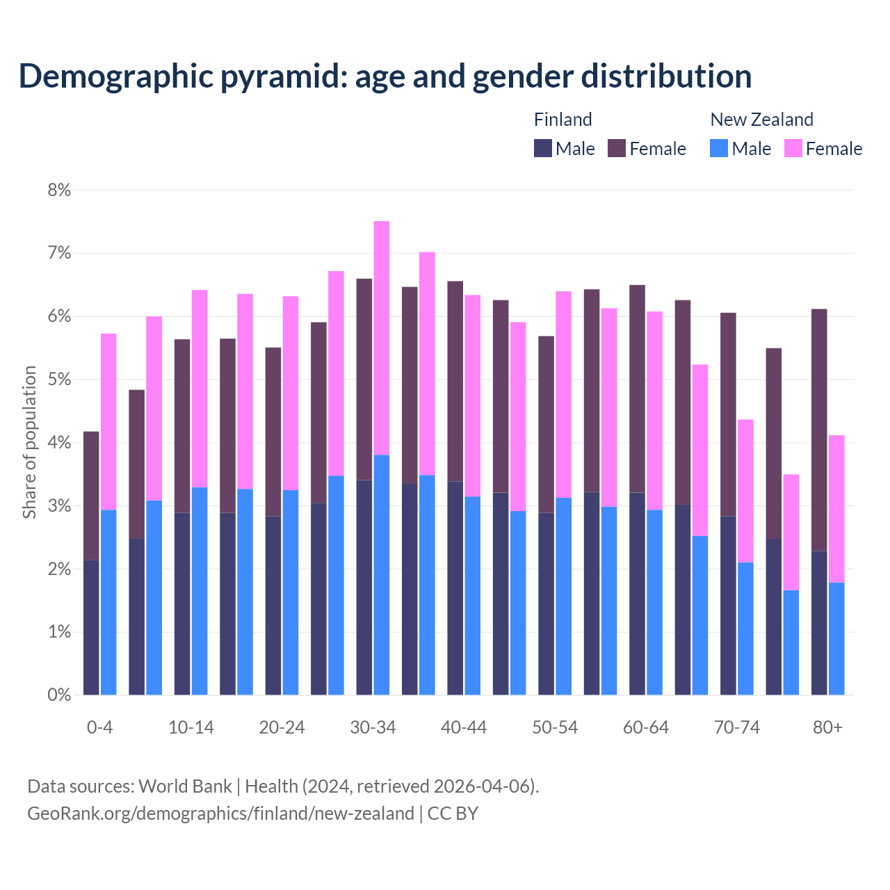 - Finland is ranked 22/196 by median age (oldest to youngest) vs 56/196 for New Zealand.