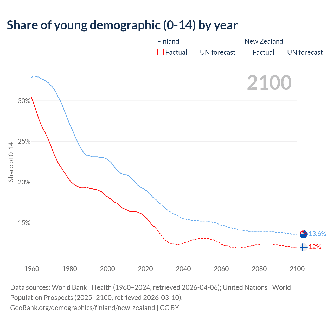 - The share of young demographic (0-15 years old) in Finland is 14.6% vs 18.1% in New Zealand.