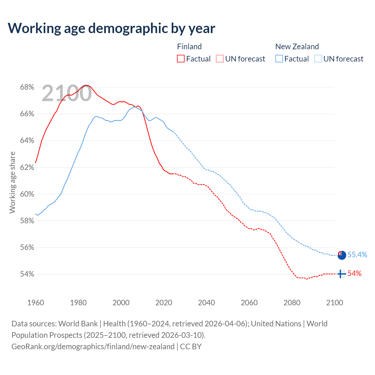 - Finland has 3.46M working age adults (aged 15-64) vs 3.48M in New Zealand.