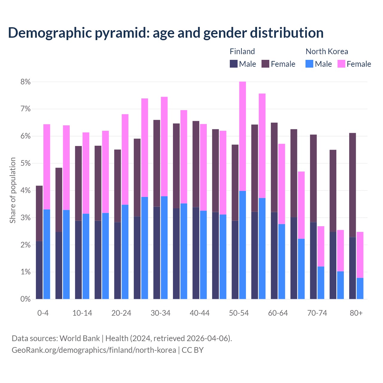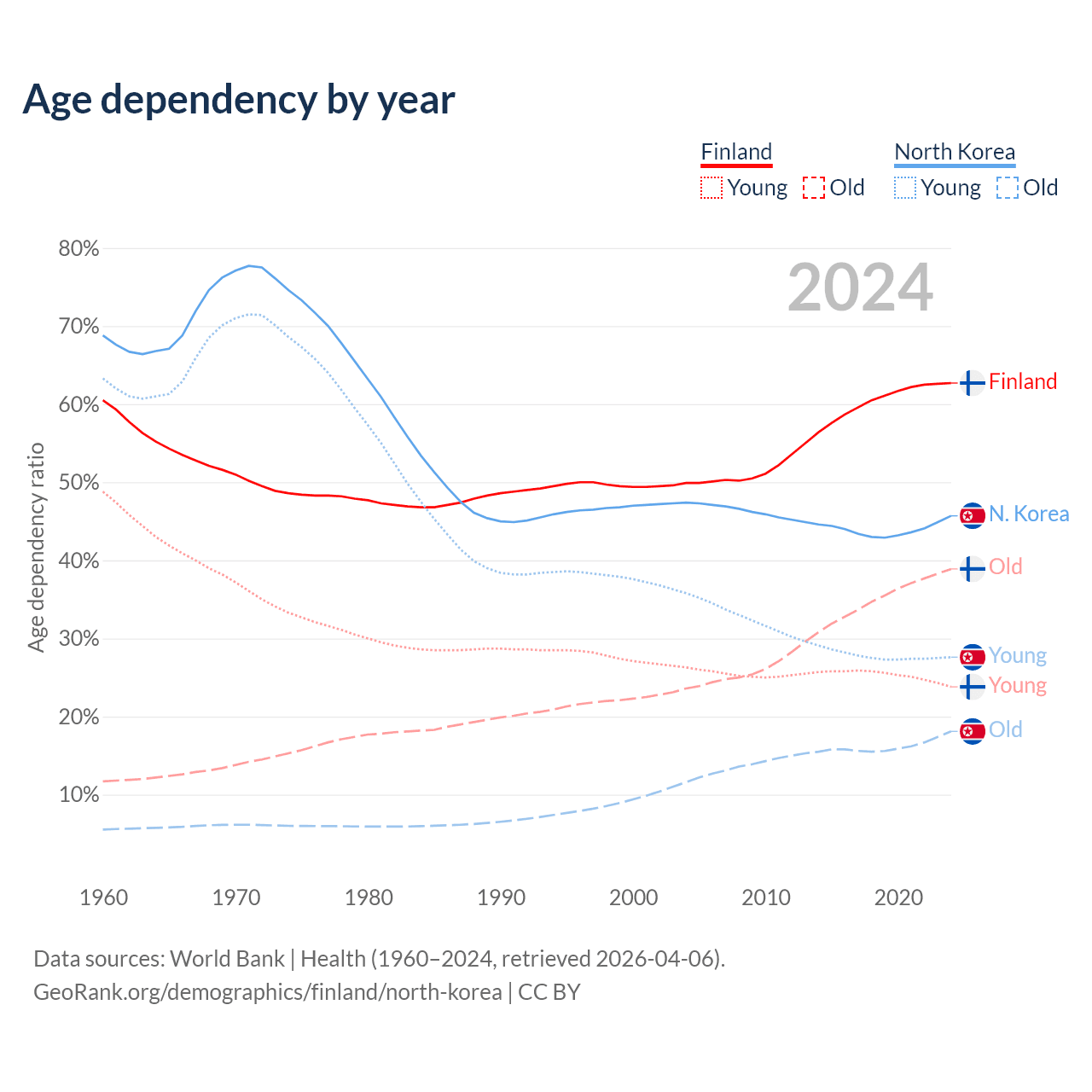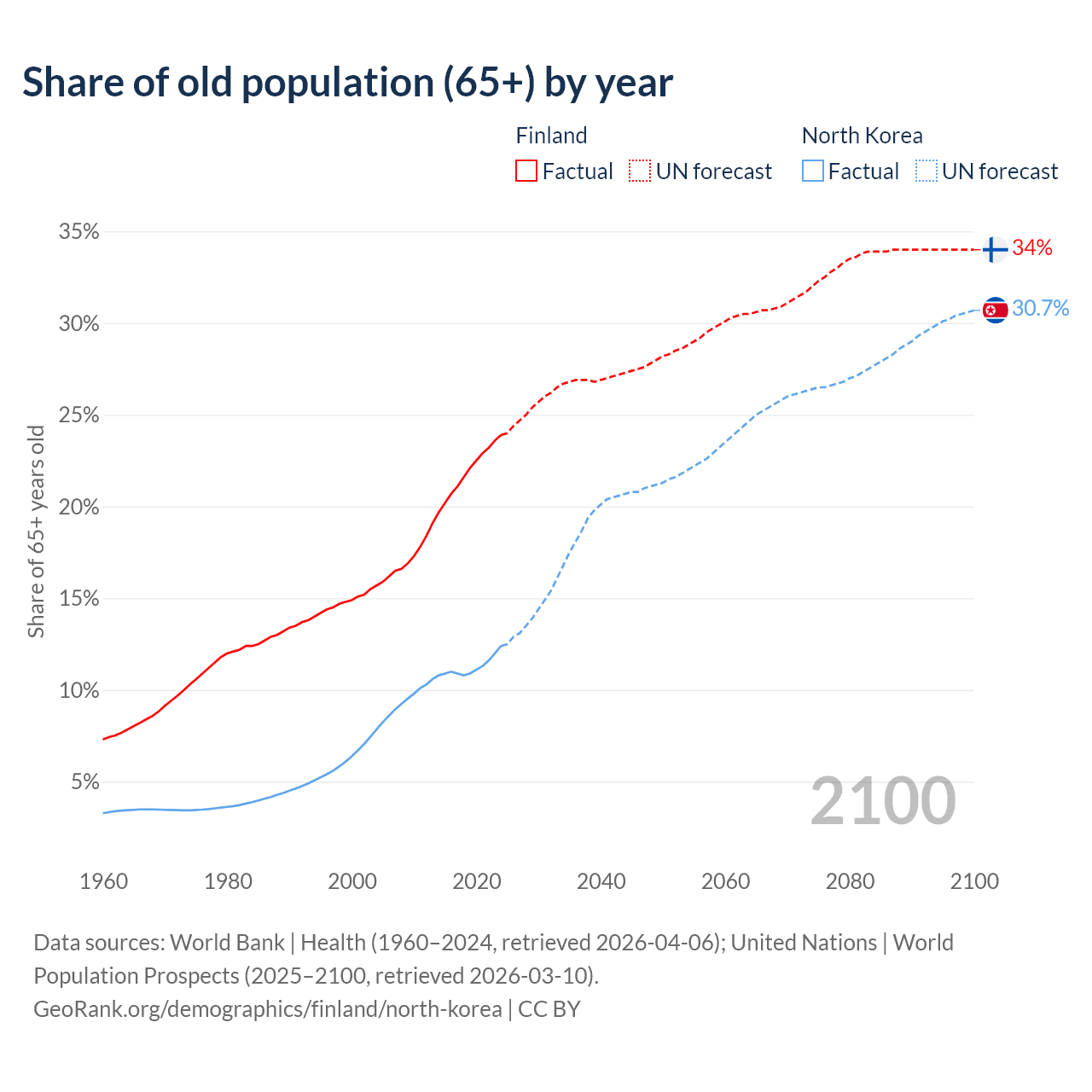 - The share of old-age demographic (65+) in Finland is 23.9% vs 12.4% in North Korea.