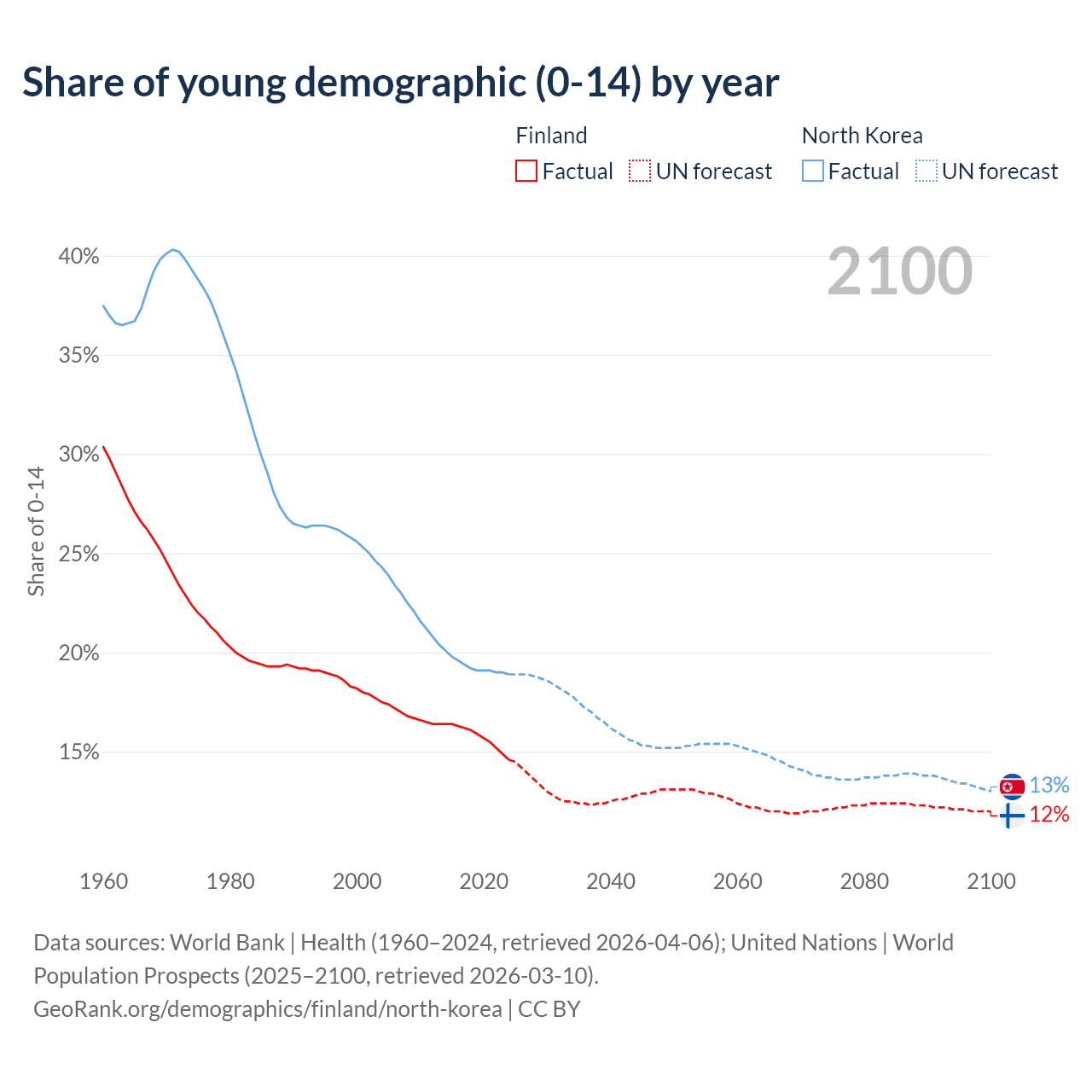 - The share of young demographic (0-15 years old) in Finland is 14.6% vs 18.9% in North Korea.