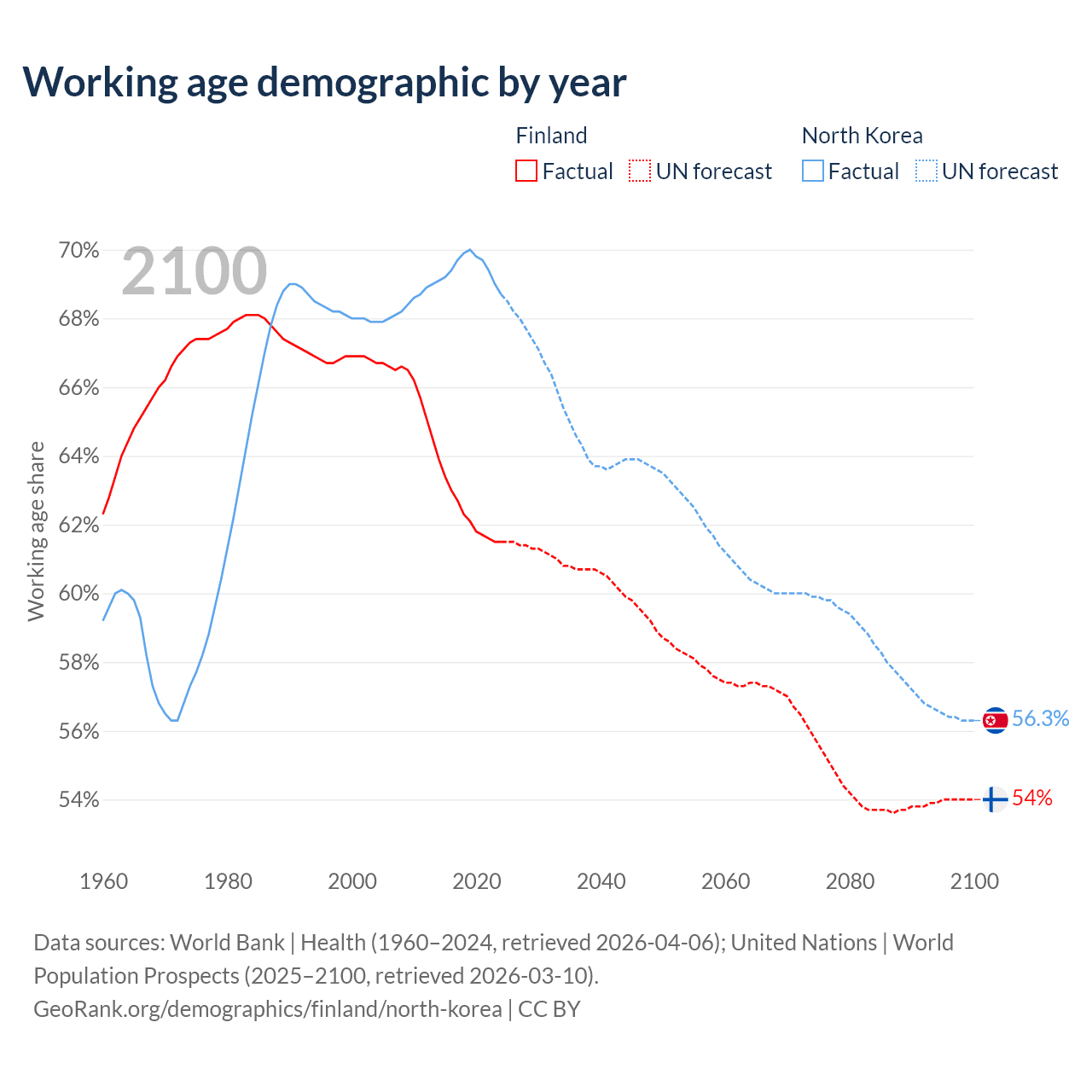- Finland has 3.46M working age adults (aged 15-64) vs 18.3M in North Korea.