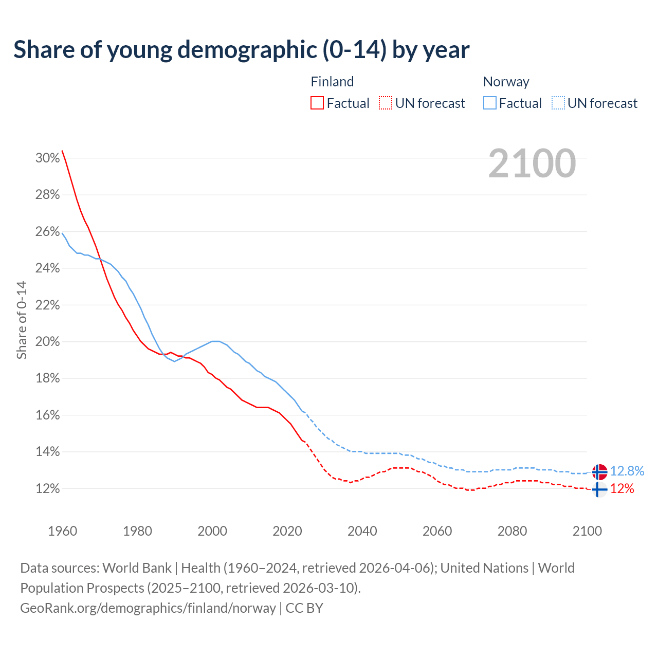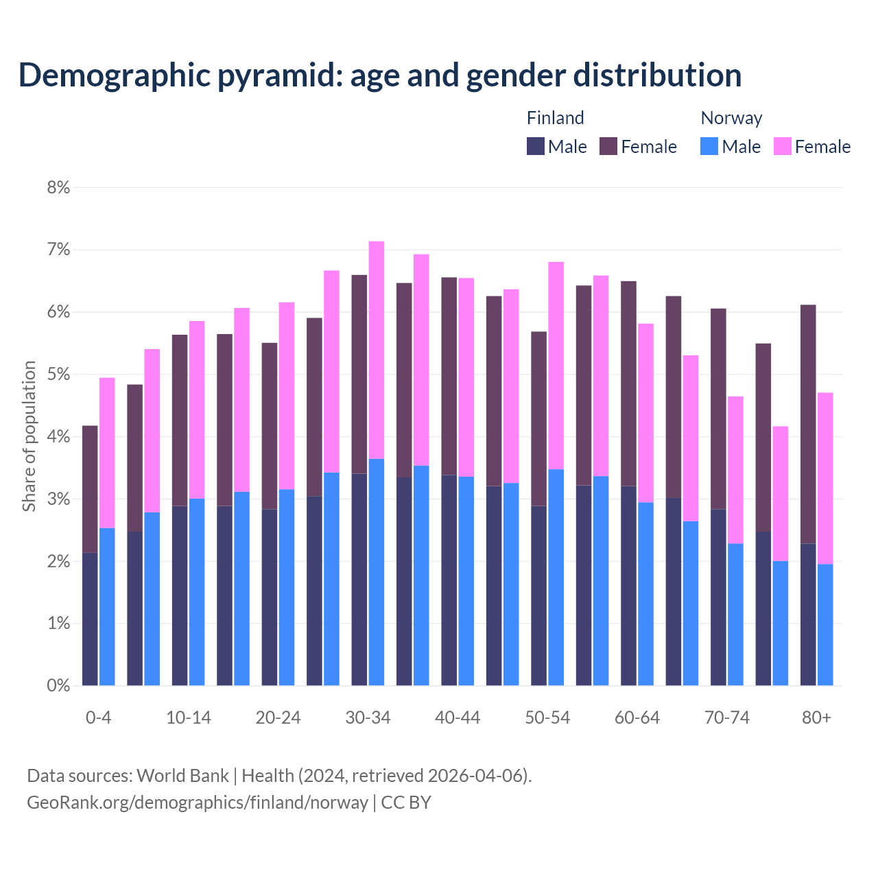 - As of 2026, the population of Finland is 5.63M vs 5.67M in Norway.