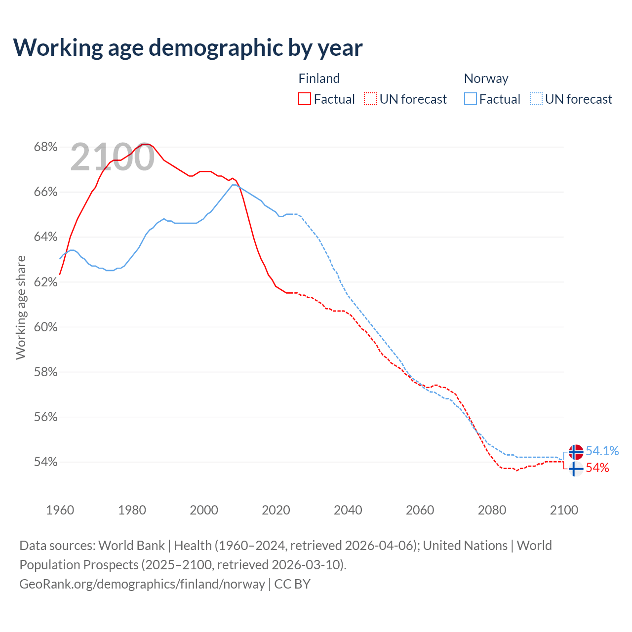 - Finland has 3.46M working age adults (aged 15-64) vs 3.69M in Norway.