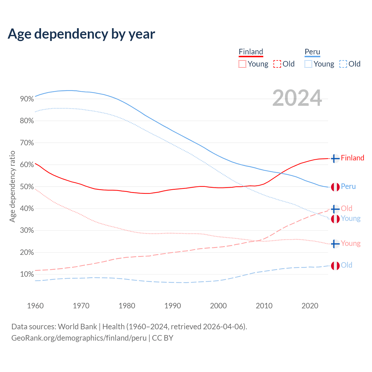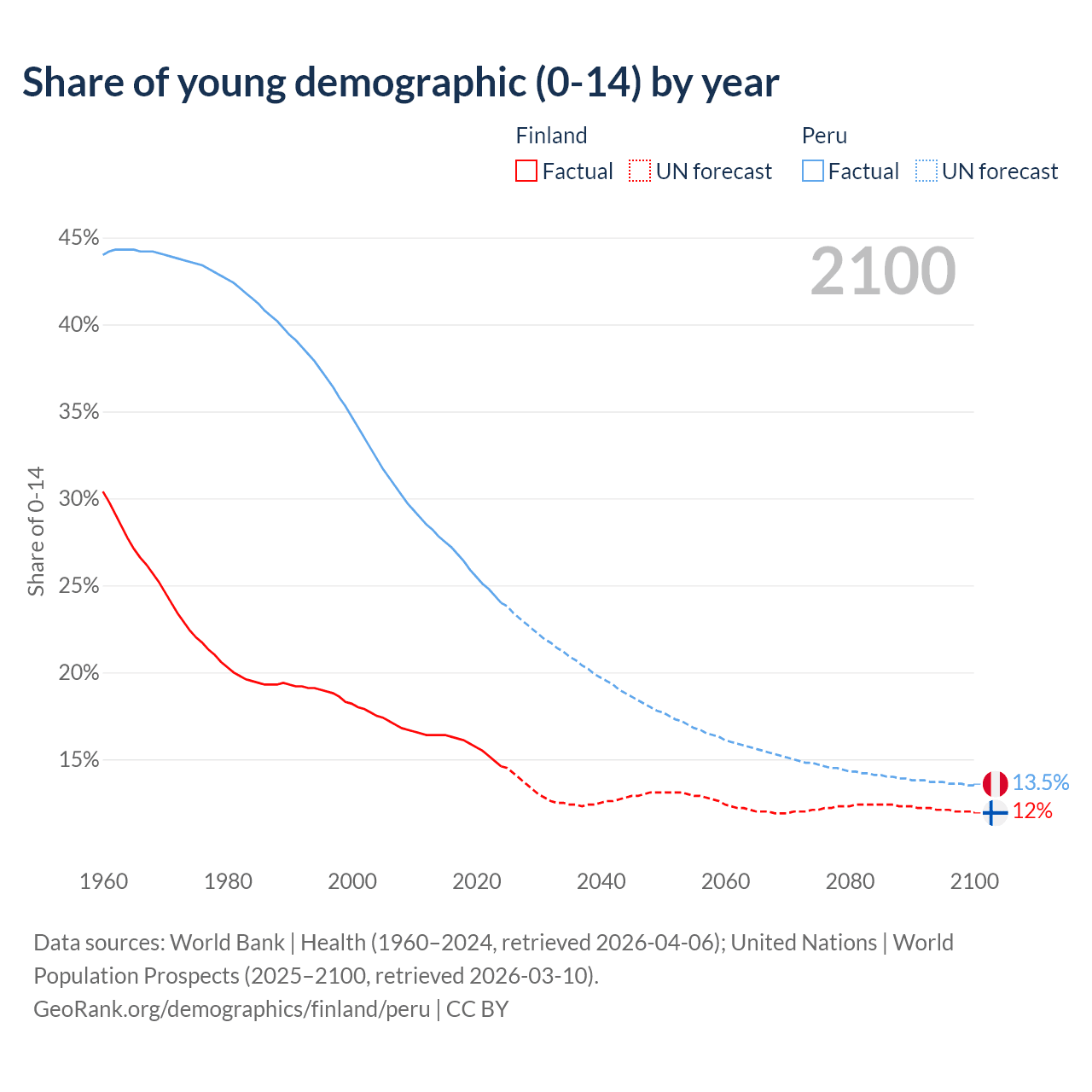- The share of young demographic (0-15 years old) in Finland is 14.6% vs 24% in Peru.