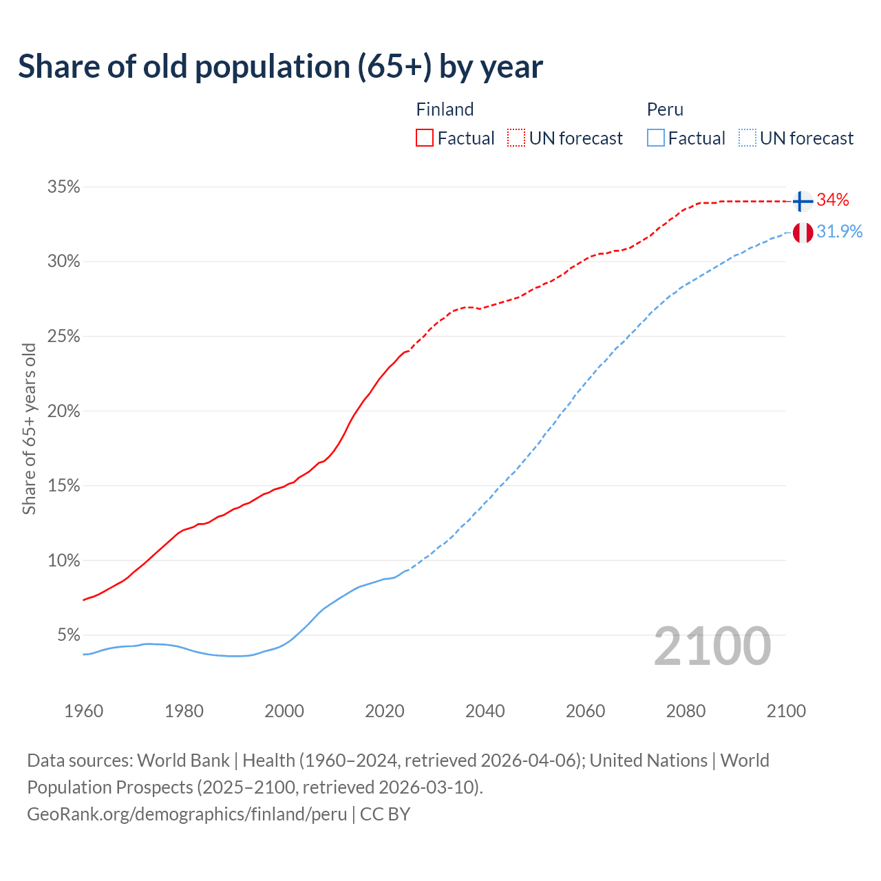 The share of older people aged 65 and over is 23.9% in Finland and 9.23% in Peru. Life expectancy in Finland compared to Peru .