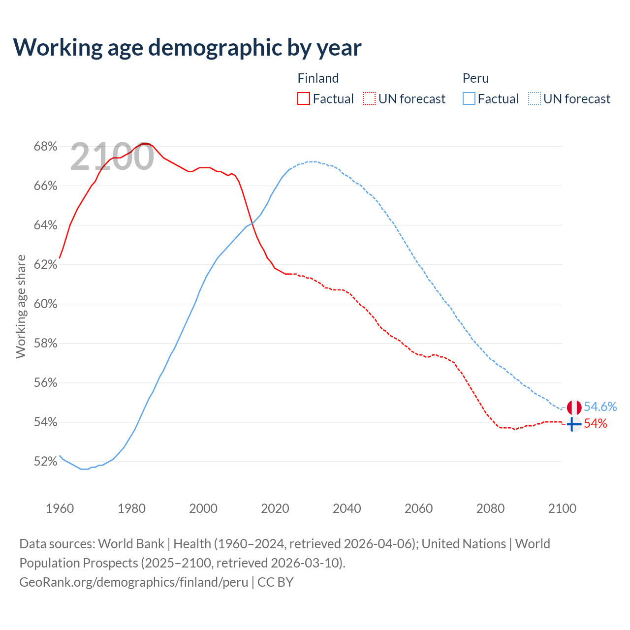 Median age Finland vs Peru, 1960-2100