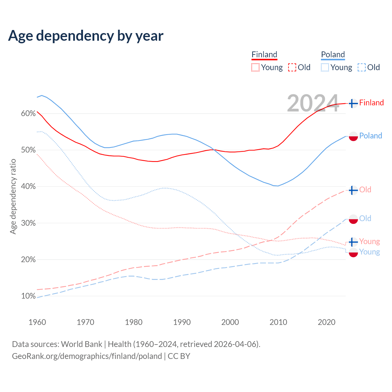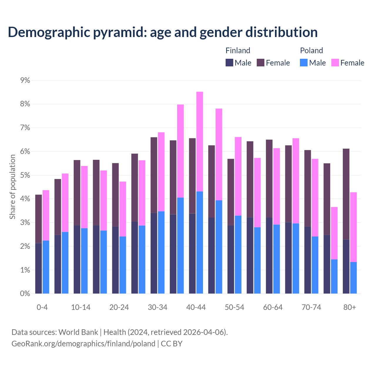 - Finland is ranked 22/196 by median age (oldest to youngest) vs 30/196 for Poland.