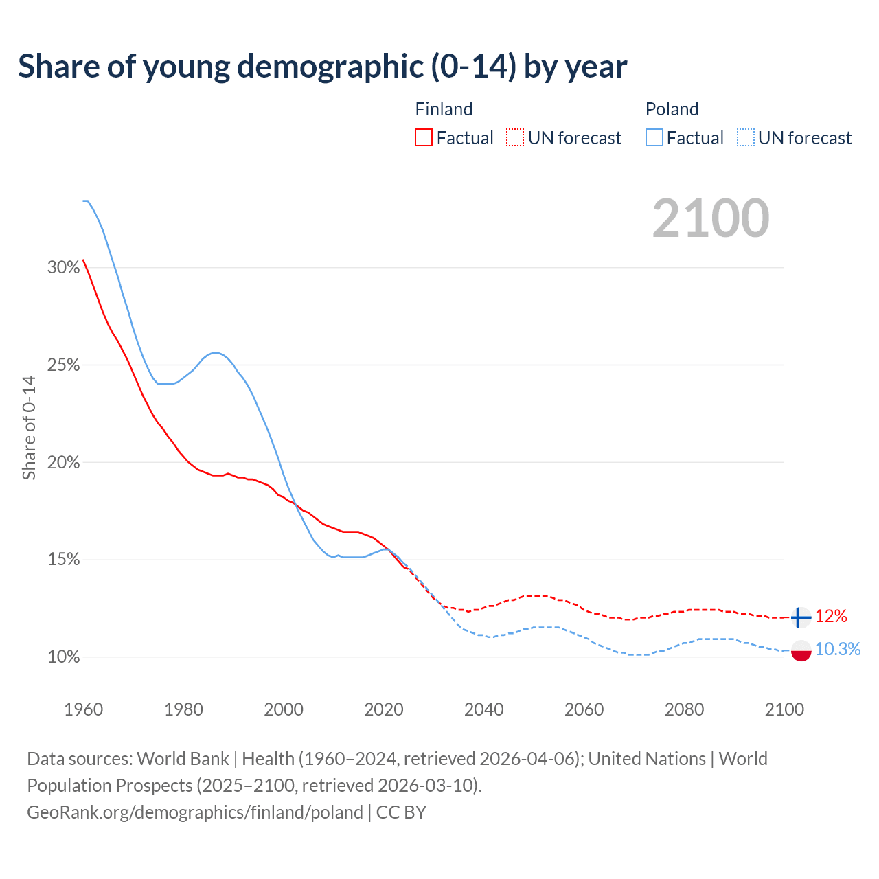 - The share of young demographic (0-15 years old) in Finland is 14.6% vs 14.8% in Poland.