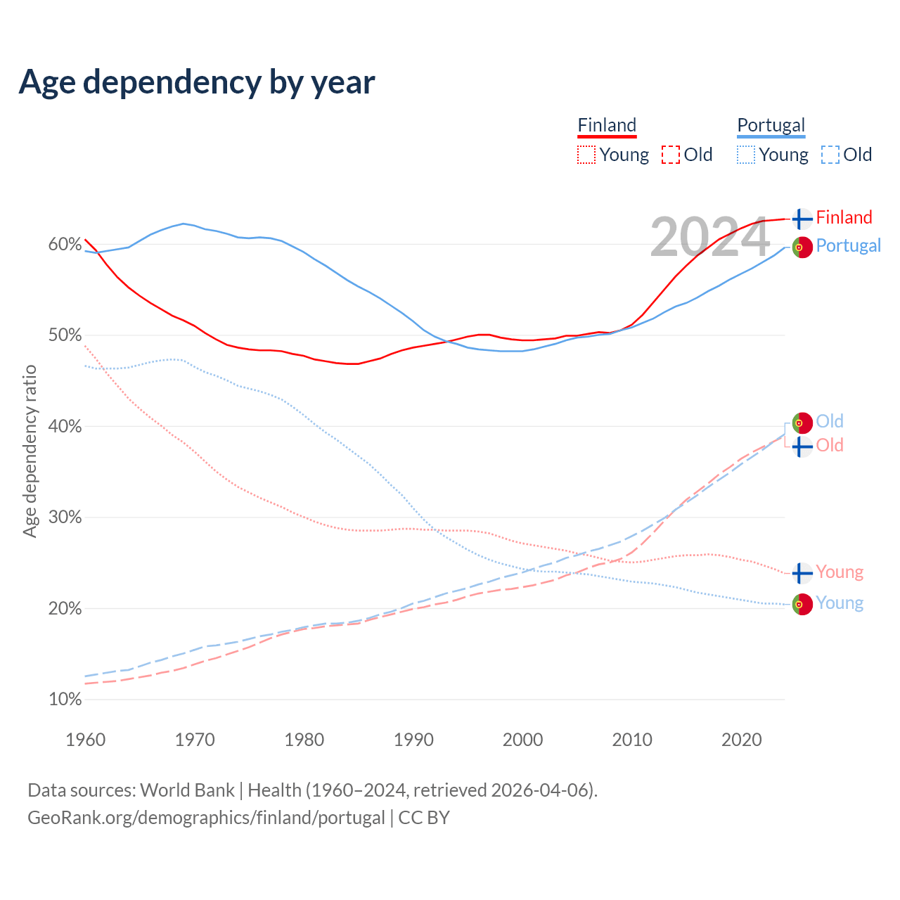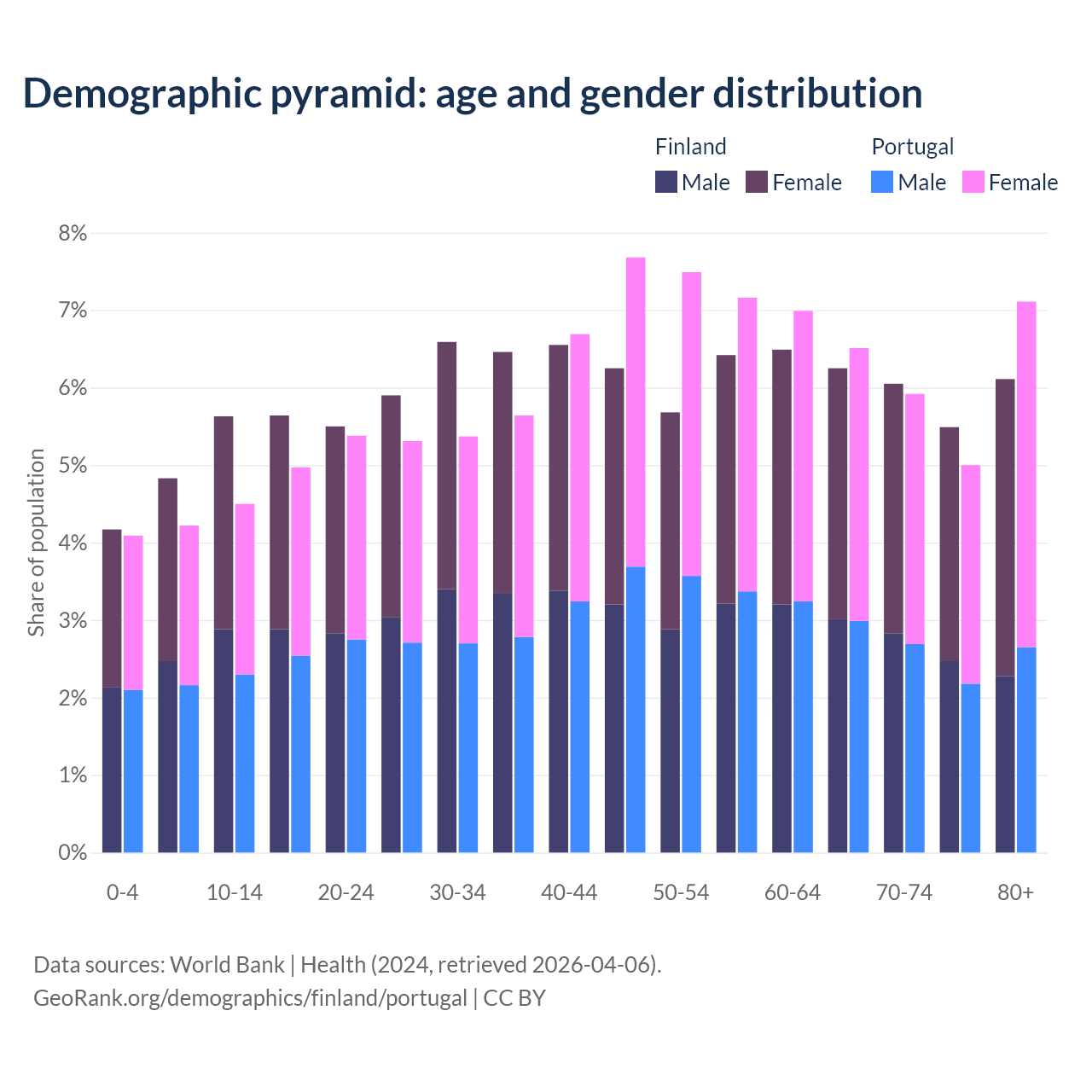 - Finland is ranked 22/196 by median age (oldest to youngest) vs 5/196 for Portugal.