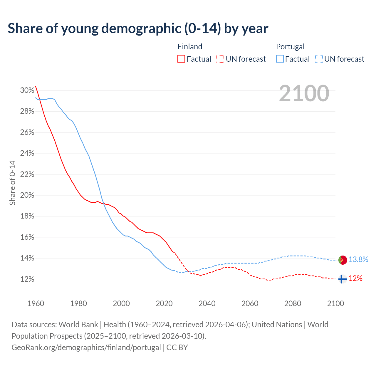 - The share of young demographic (0-15 years old) in Finland is 14.6% vs 12.8% in Portugal.