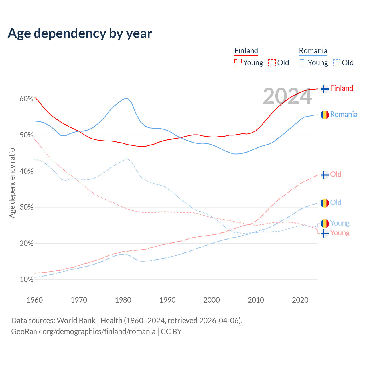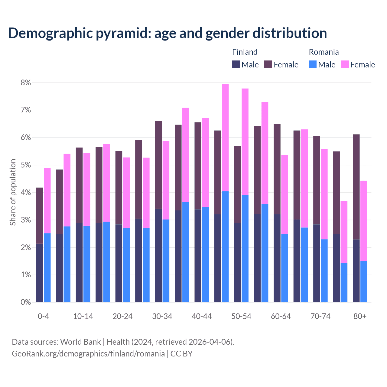 - Finland is ranked 22/196 by median age (oldest to youngest) vs 23/196 for Romania.