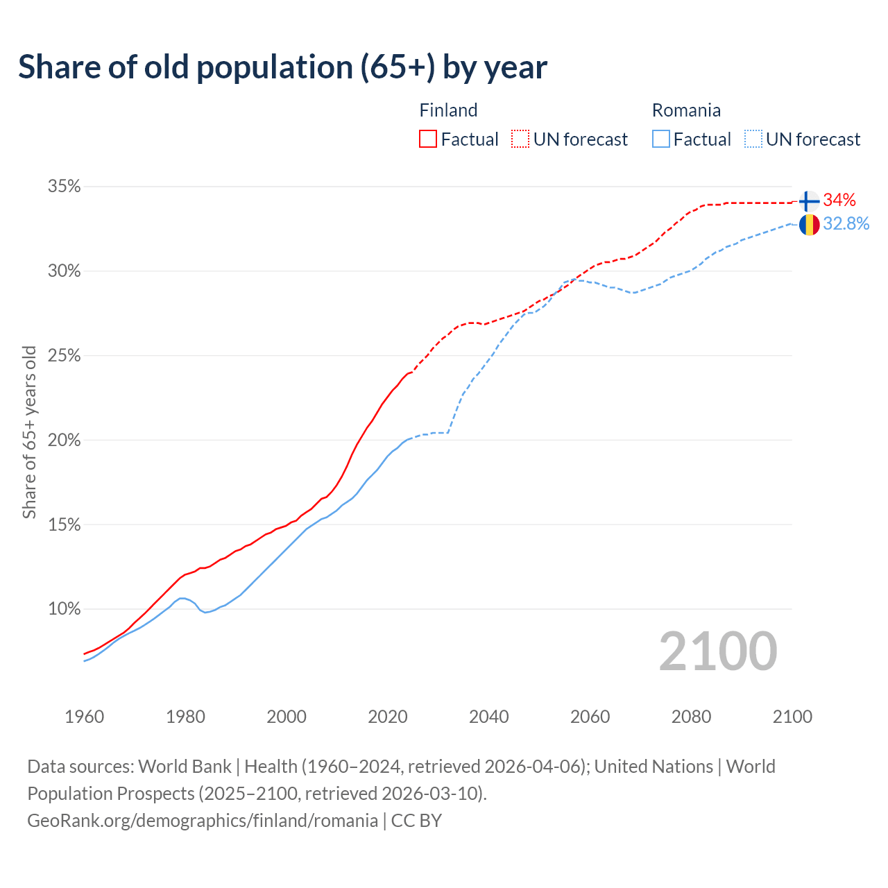 The share of older people aged 65 and over is 23.9% in Finland and 20% in Romania. Life expectancy in Finland compared to Romania .
