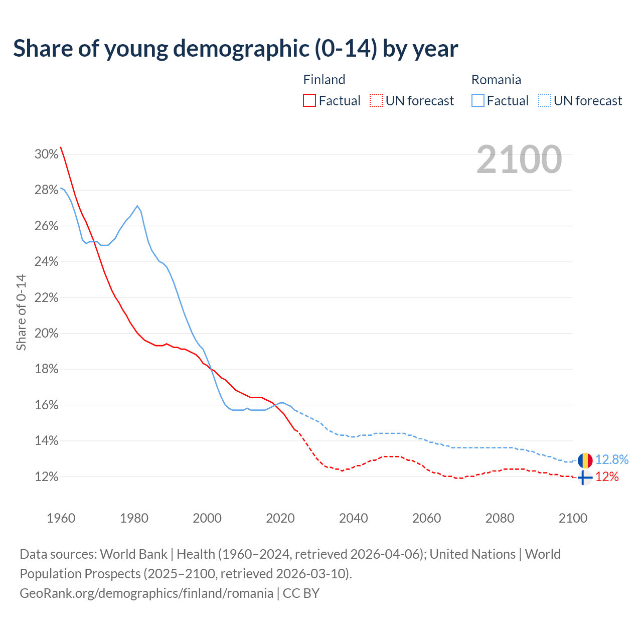 - The share of young demographic (0-15 years old) in Finland is 14.6% vs 15.7% in Romania.