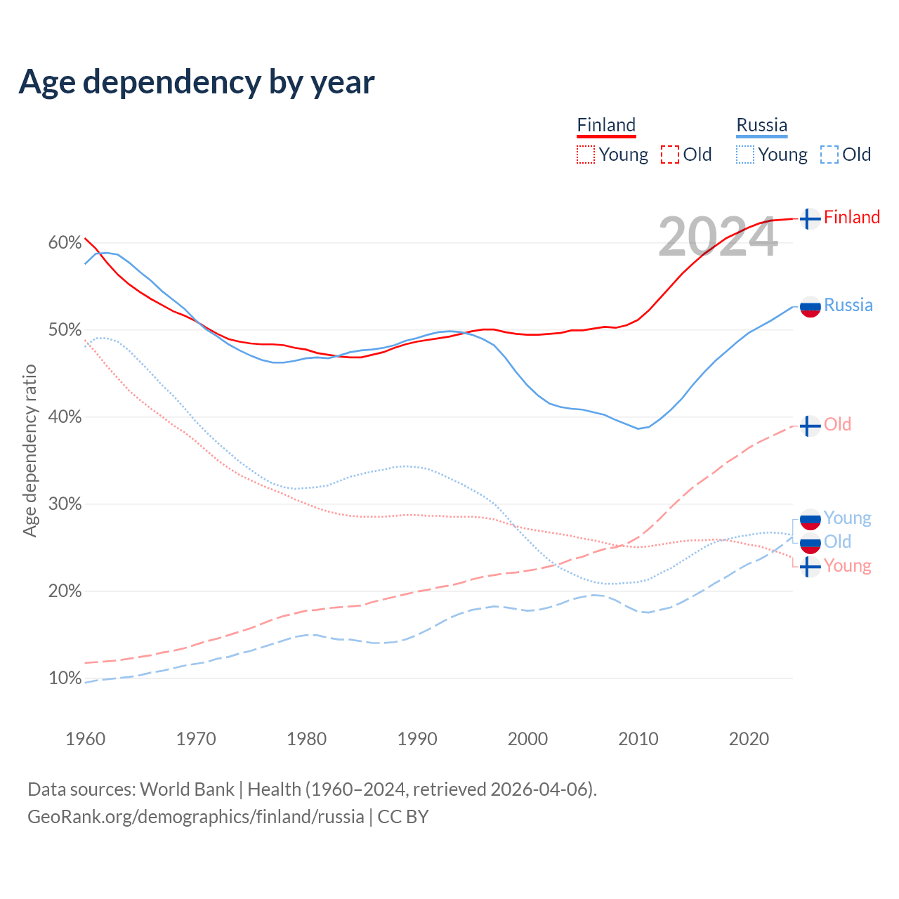 - Finland is ranked 22/196 by median age (oldest to youngest) vs 42/196 for Russia.