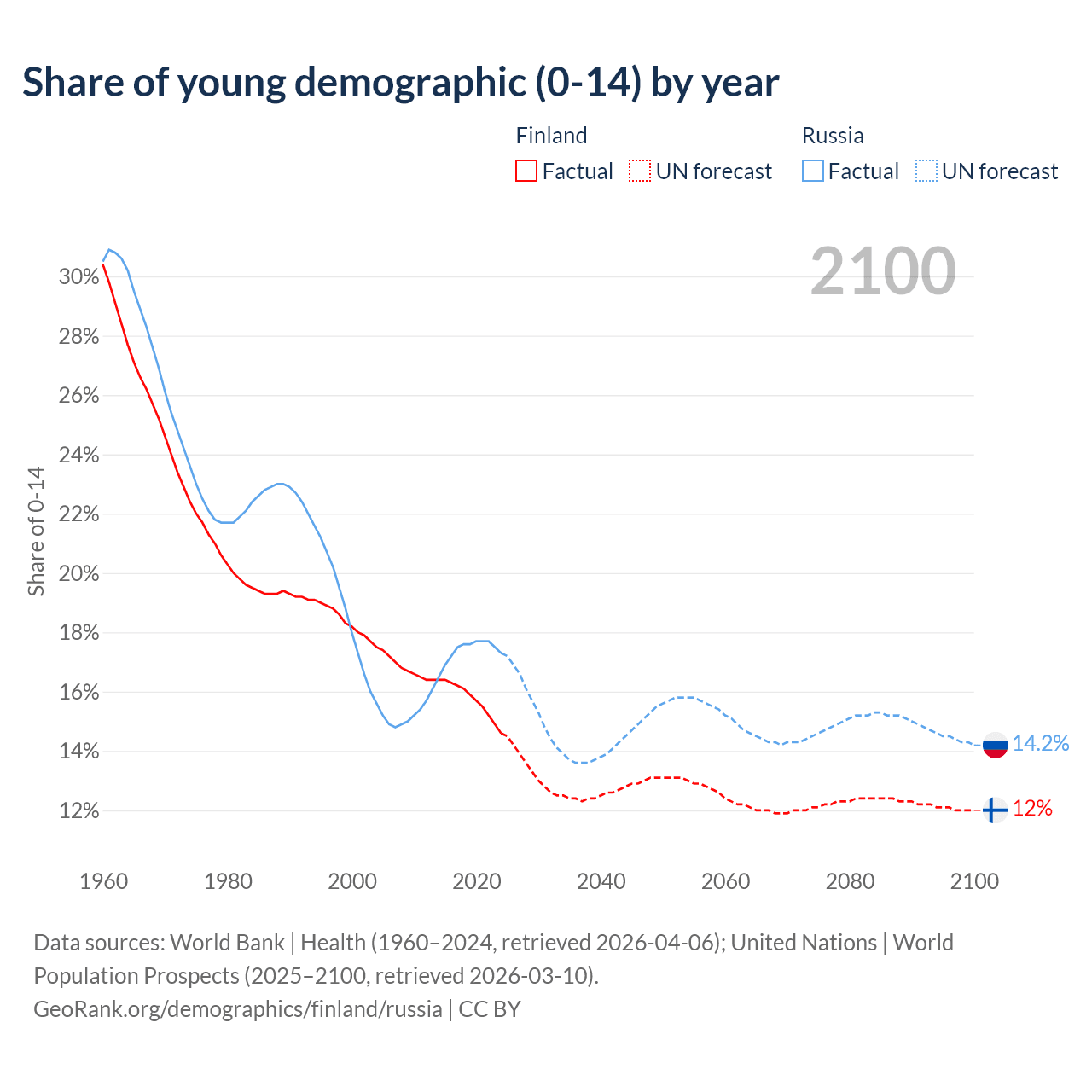 - The share of young demographic (0-15 years old) in Finland is 14.6% vs 17.3% in Russia.