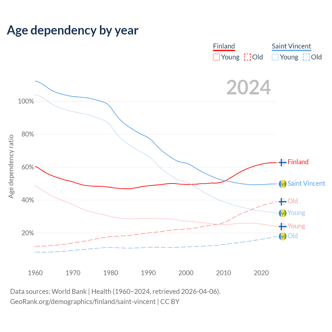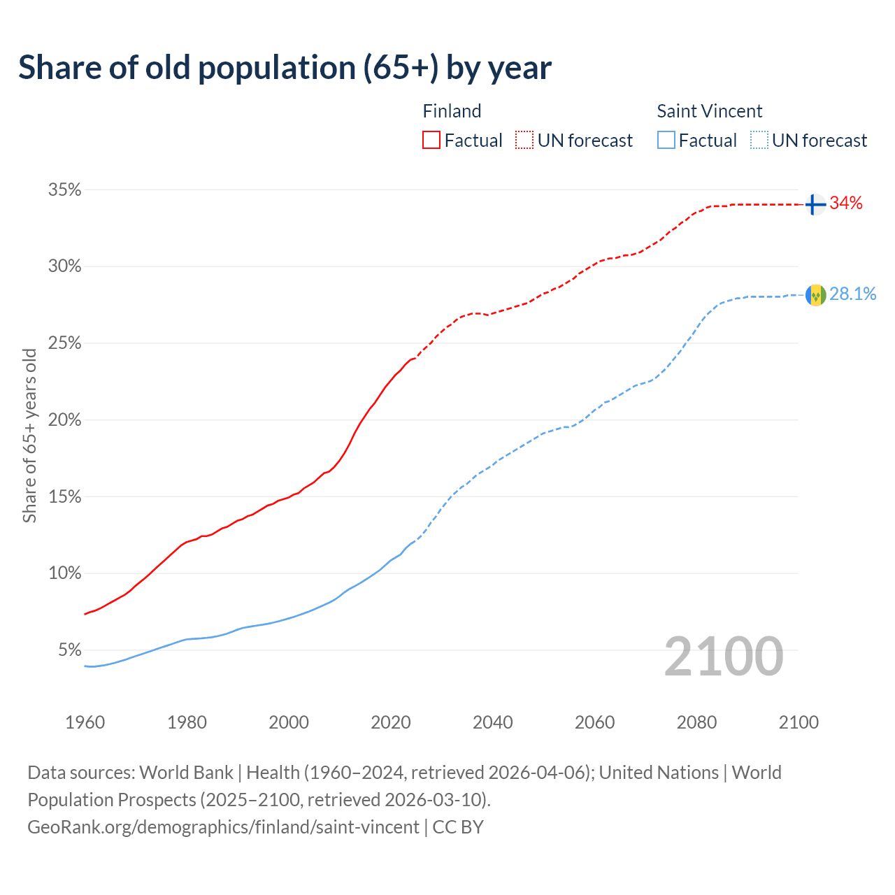 - The share of old-age demographic (65+) in Finland is 23.9% vs 11.9% in Saint Vincent.