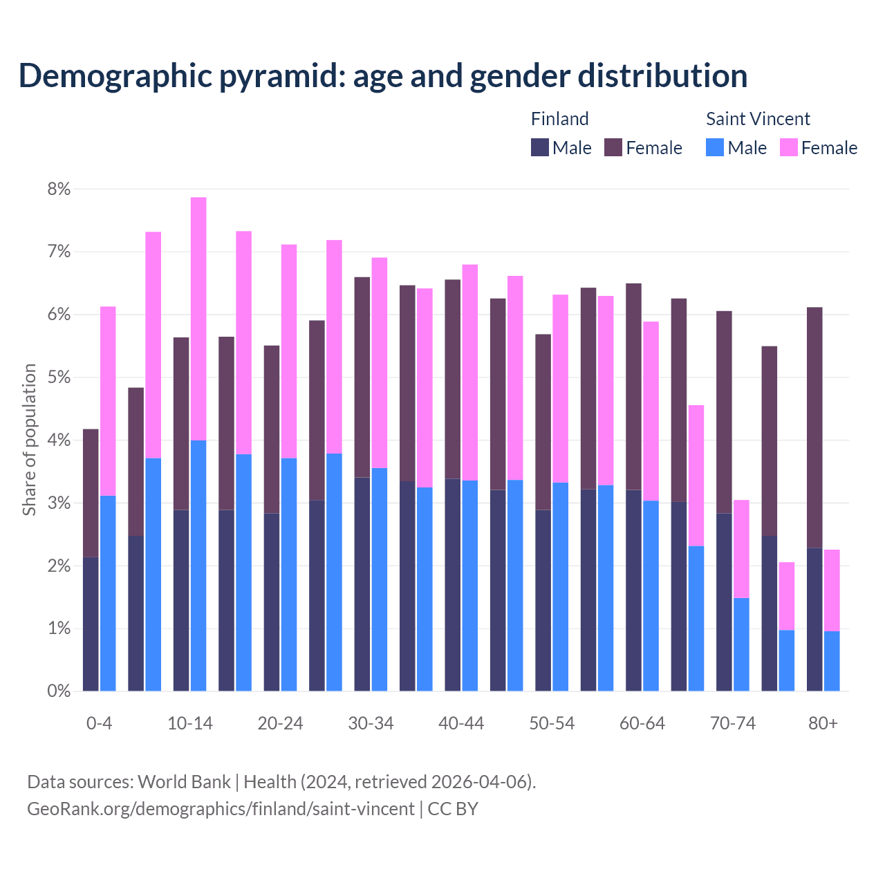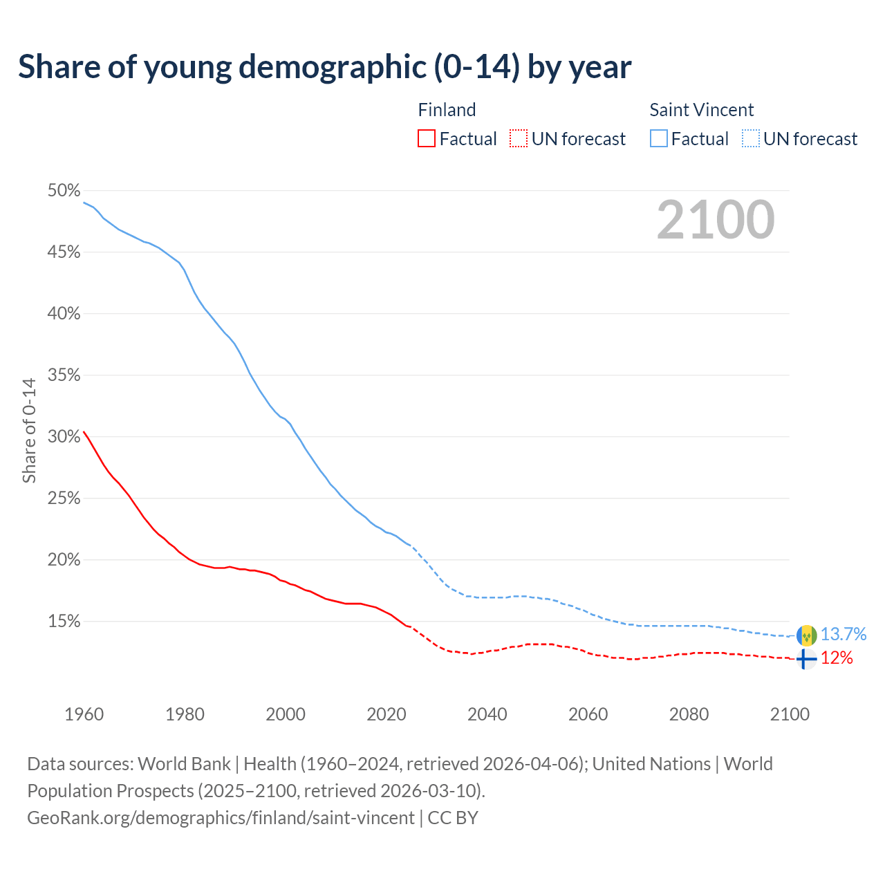 - The share of young demographic (0-15 years old) in Finland is 14.6% vs 21.3% in Saint Vincent.