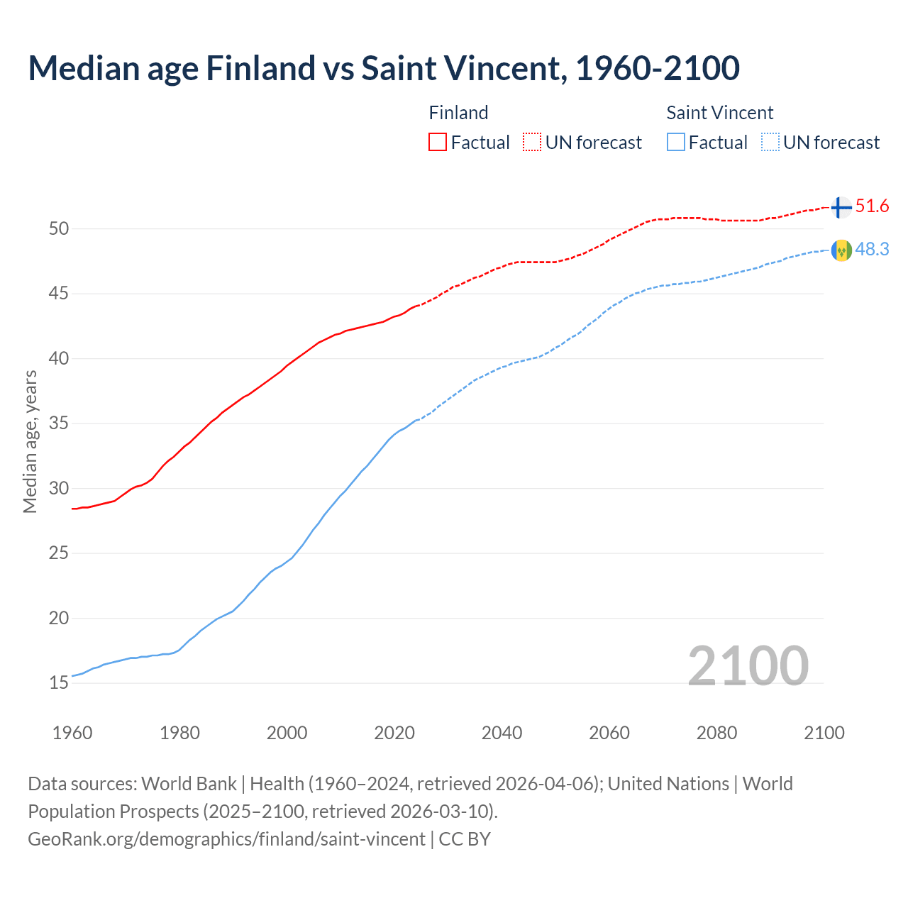 Median age Finland vs Saint Vincent, 1960-2100