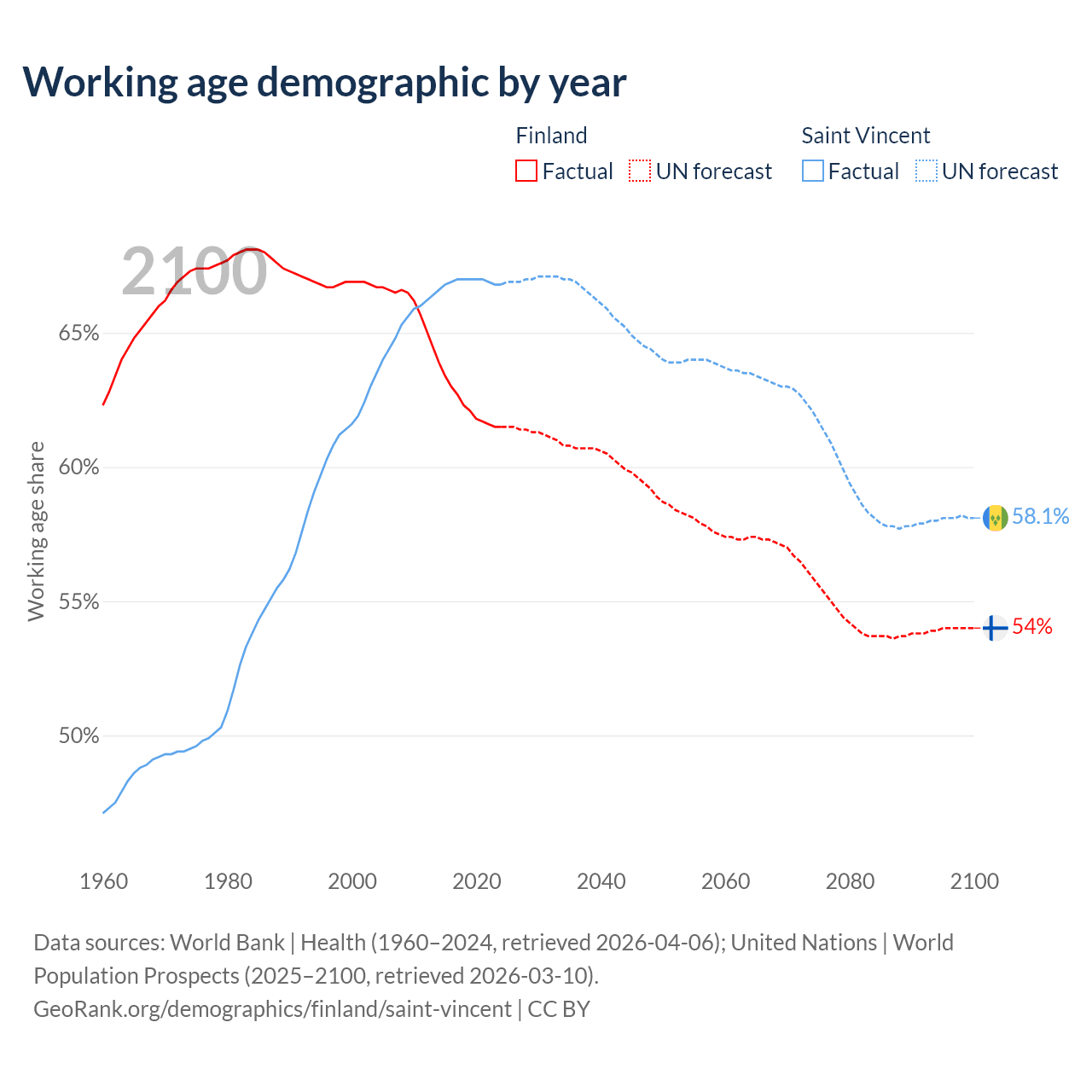 - Finland has 3.46M working age adults (aged 15-64) vs 66.3K in Saint Vincent.