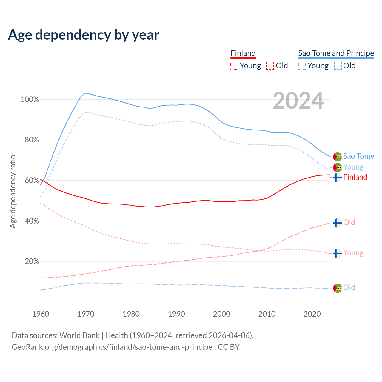 - The share of old-age demographic (65+) in Finland is 23.9% vs 3.9% in Sao Tome and Principe.
