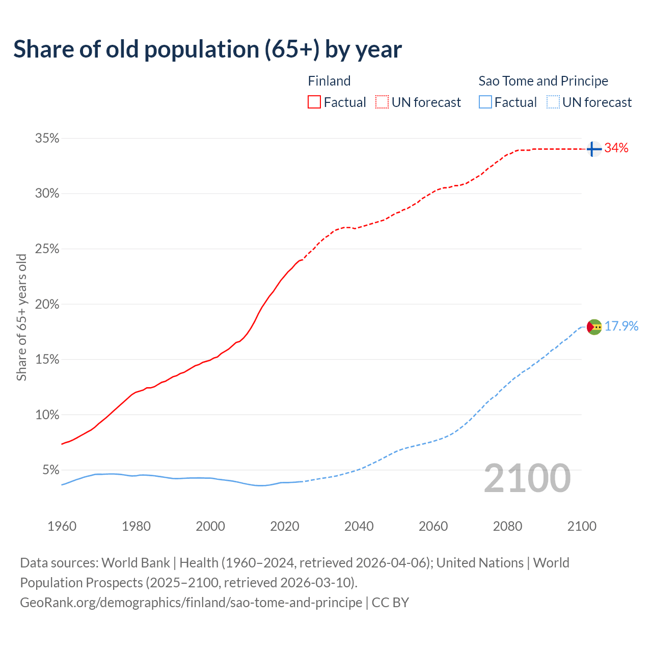 The share of older people aged 65 and over is 23.9% in Finland and 3.9% in Sao Tome and Principe. Life expectancy in Finland compared to Sao Tome and Principe .