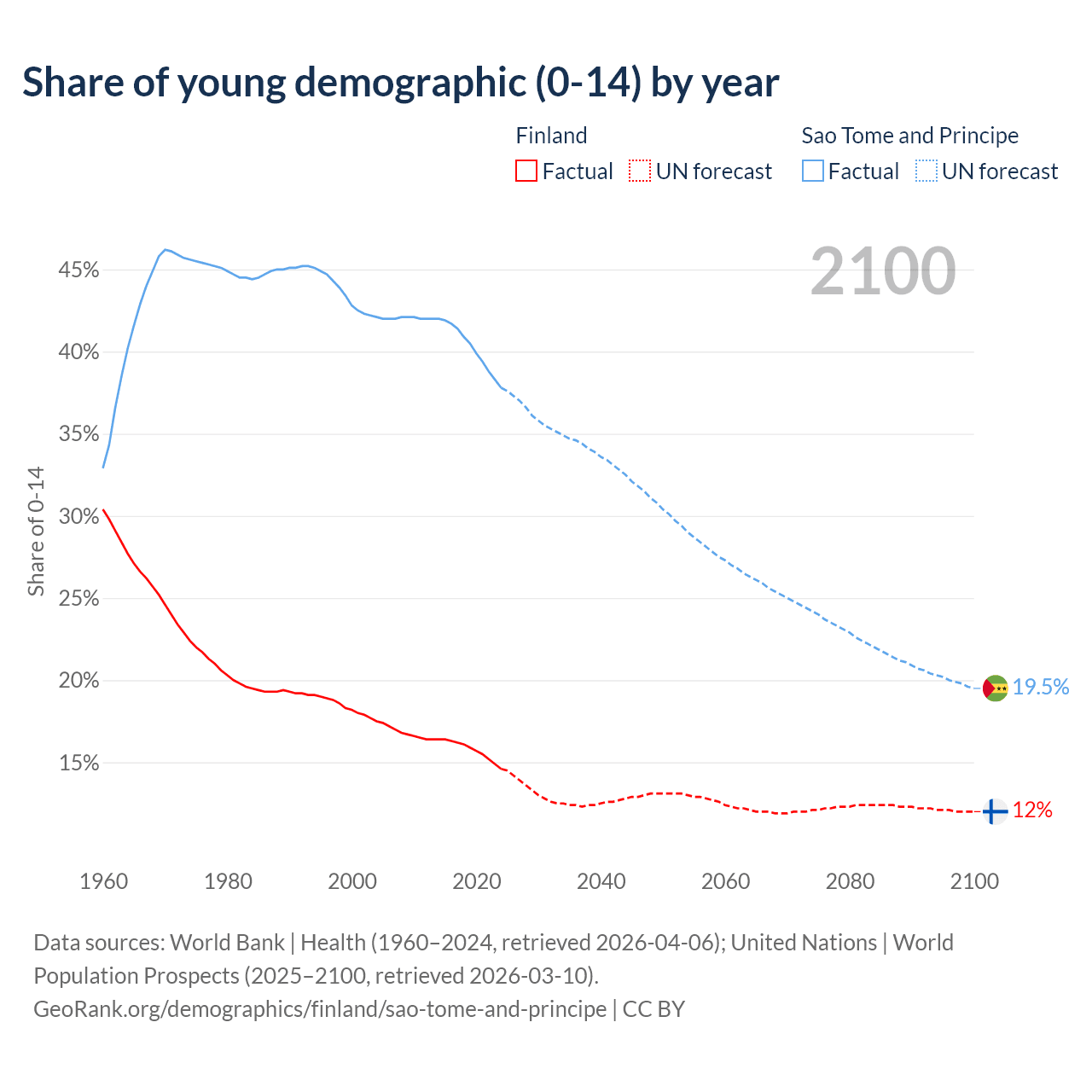 - The share of young demographic (0-15 years old) in Finland is 14.6% vs 37.8% in Sao Tome and Principe.