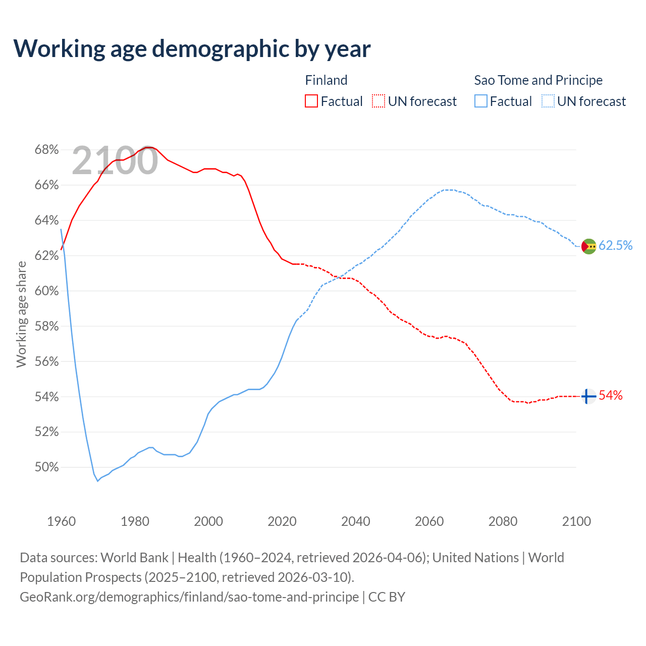 - Finland has 3.46M working age adults (aged 15-64) vs 144K in Sao Tome and Principe.