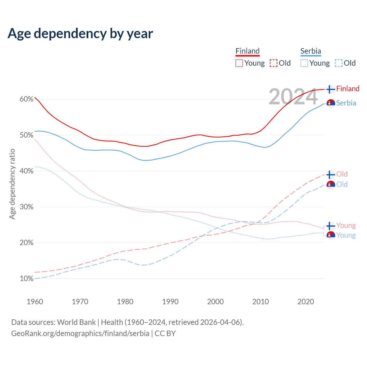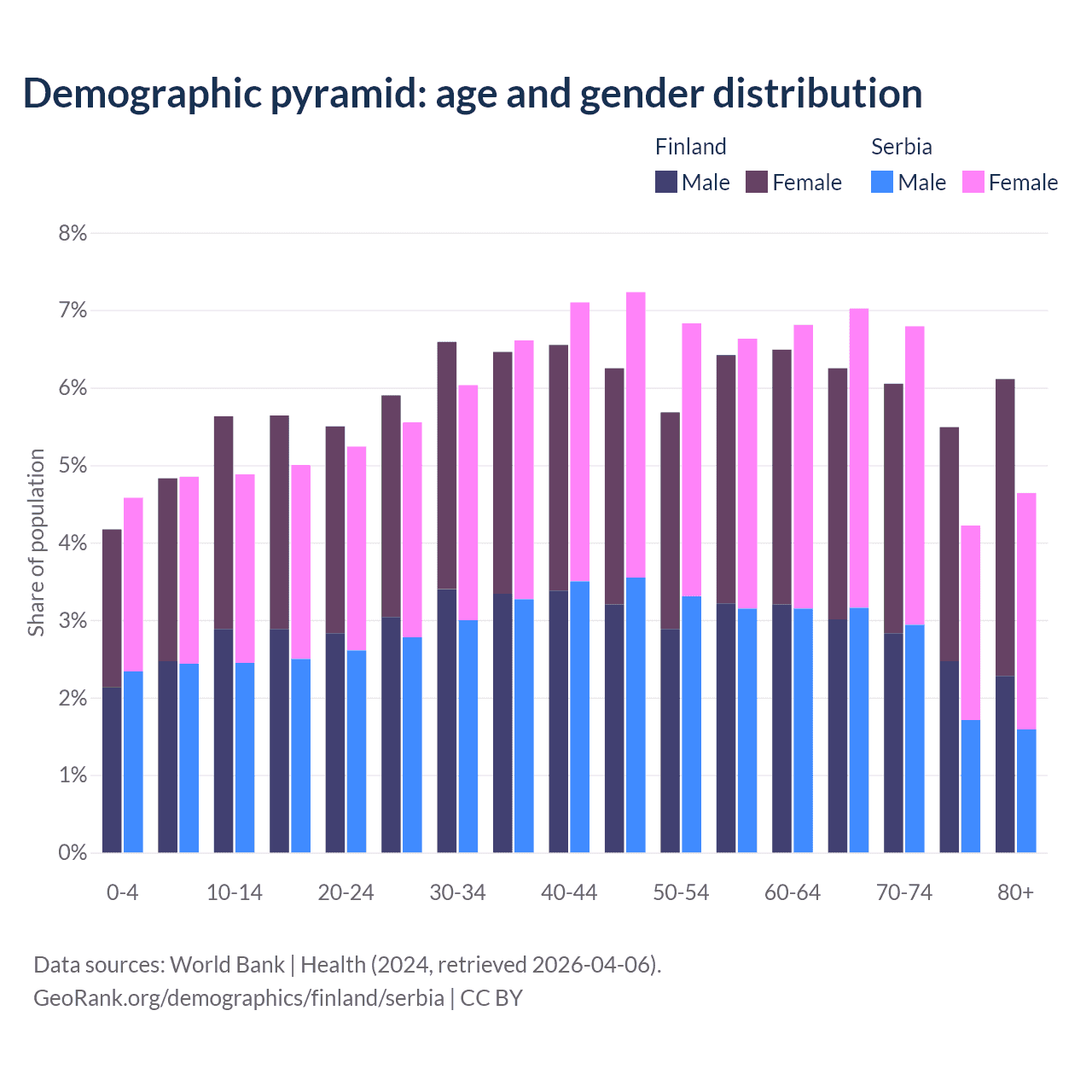 - Finland is ranked 22/196 by median age (oldest to youngest) vs 15/196 for Serbia.