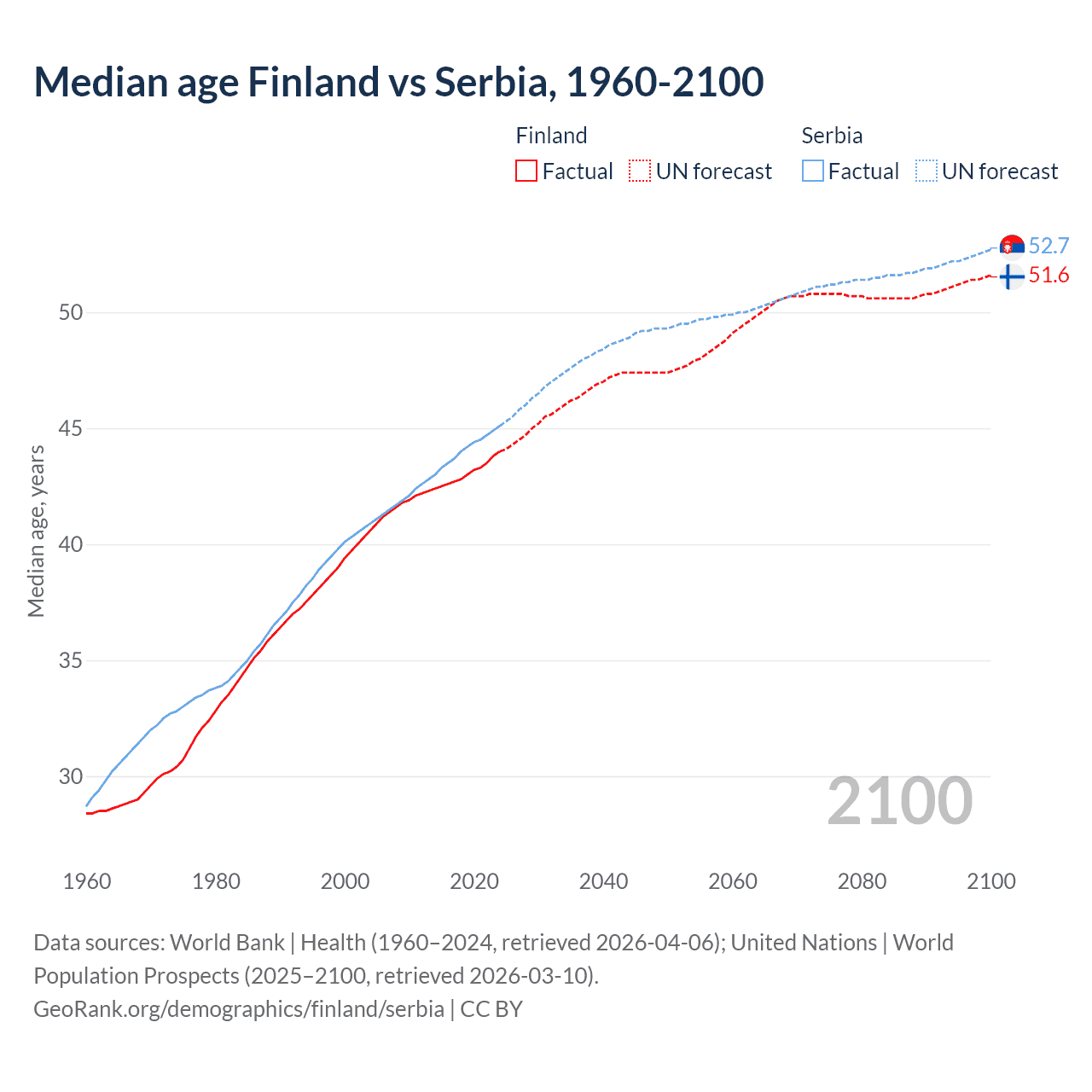 Median age Finland vs Serbia, 1960-2100
