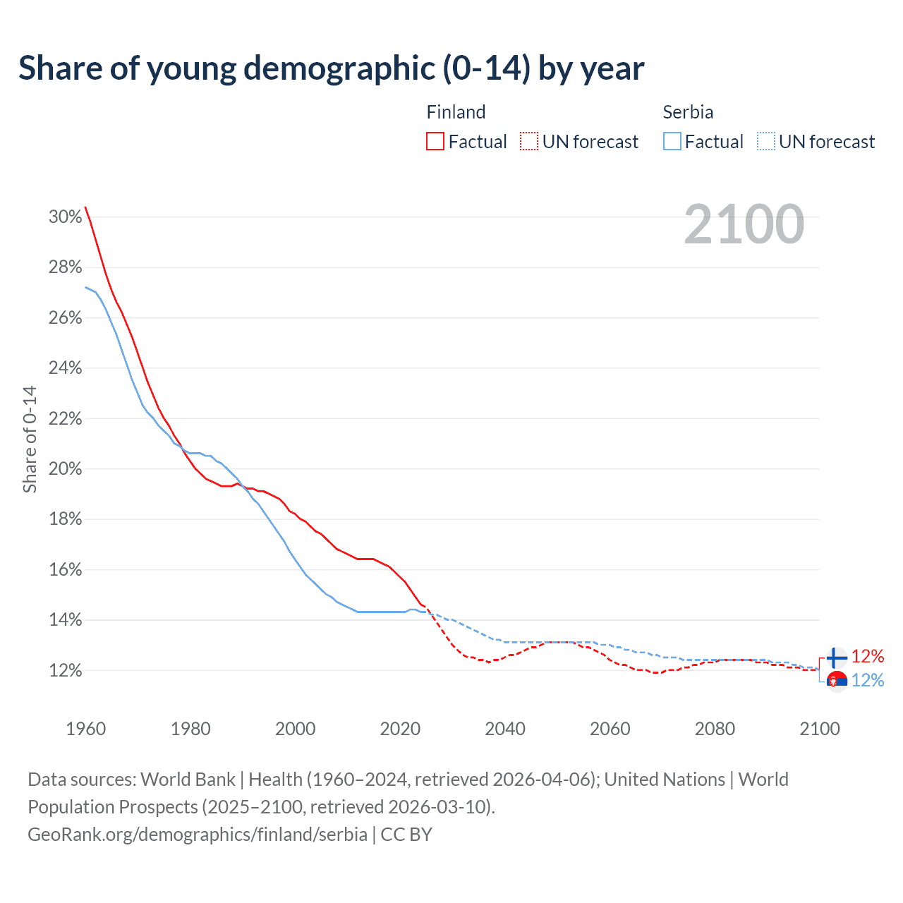 - The share of young demographic (0-15 years old) in Finland is 14.6% vs 14.3% in Serbia.